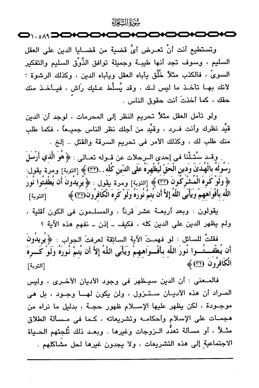 وقد سُئلْنا في إحدى الرحلات عن قوله تعالى: {هُوَ الذي أَرْسَلَ رَسُولَهُ بالهدى وَدِينِ الحق لِيُظْهِرَهُ عَلَى الدين كُلِّهِ} [التوبة: 33] ومرة يقول: {وَلَوْ كَرِهَ المشركون} [التوبة: 33] ومرة يقول: {يُرِيدُونَ أَن يُطْفِئُواْ نُورَ الله بِأَفْوَاهِهِمْ ويأبى الله إِلاَّ أَن يُتِمَّ نُورَهُ وَلَوْ كَرِهَ الكافرون} [التوبة: 32] .
