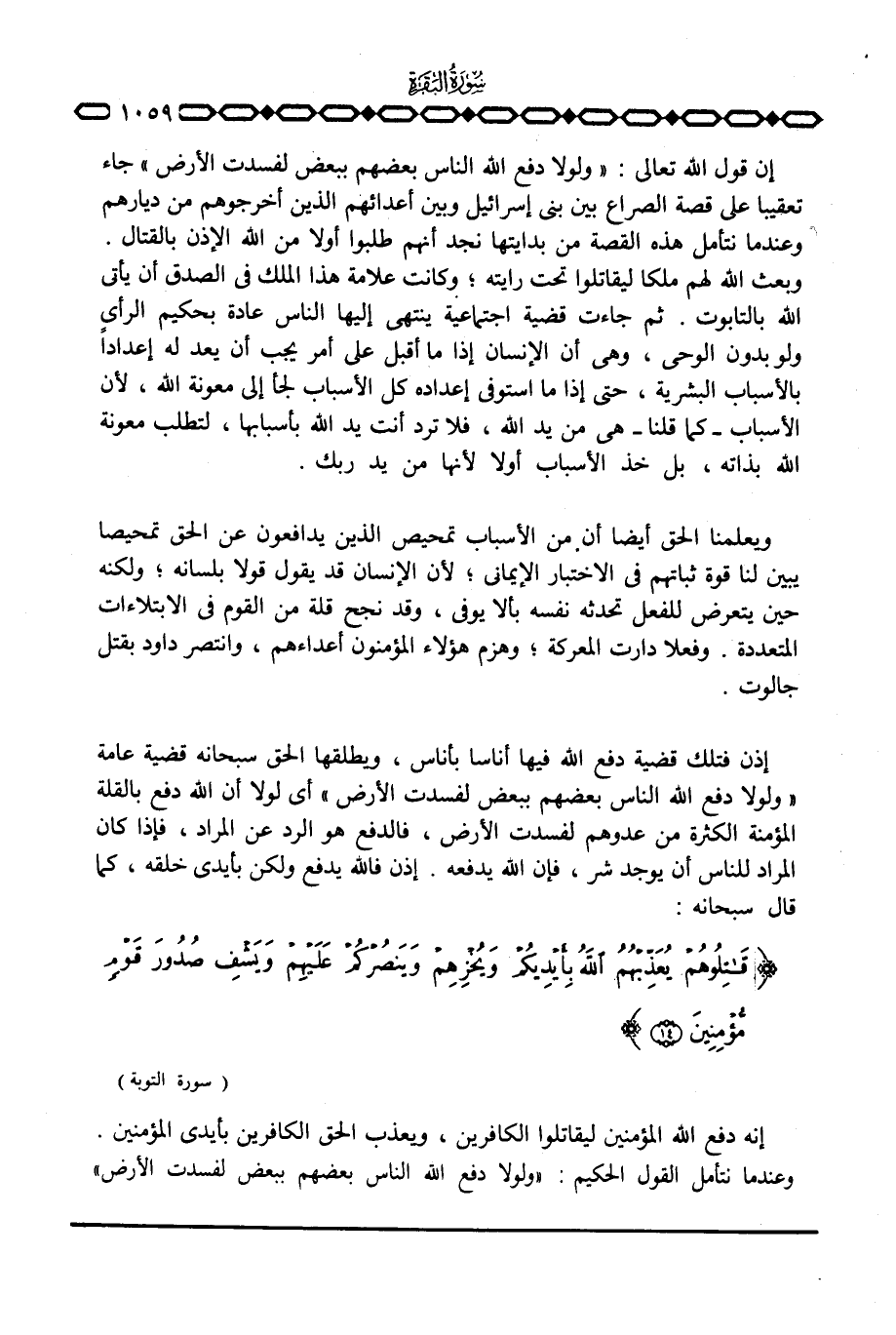 إن قول الله تعالى: {وَلَوْلاَ دَفْعُ الله الناس بَعْضَهُمْ بِبَعْضٍ لَفَسَدَتِ الأرض} جاء تعقيبا على قصة الصراع بين بني إسرائيل وبين أعدائهم الذين أخرجوهم من ديارهم وعندما نتأمل هذه القصة من بدايتها نجد أنهم طلبوا أولا من الله الإذن بالقتال. وبعث الله لهم ملكا ليقاتلوا تحت رايته؛ وكانت علامة هذا الملك في الصدق أن يأتي الله بالتابوت. ثم جاءت قضية اجتماعية ينتهي إليها الناس عادة بحكيم الرأي ولو بدون الوحي، وهي أن الإنسان إذا ما أقبل على أمر يجب أن يعد له إعداداً بالأسباب البشرية، حتى إذا ما استوفى إعداده كل الأسباب لجأ إلى معونة الله، لأن الأسباب كما قلنا هي من يد الله، فلا ترد أنت يد الله بأسبابها، لتطلب معونة الله بذاته، بل خذ الأسباب أولا لأنها من يد ربك.