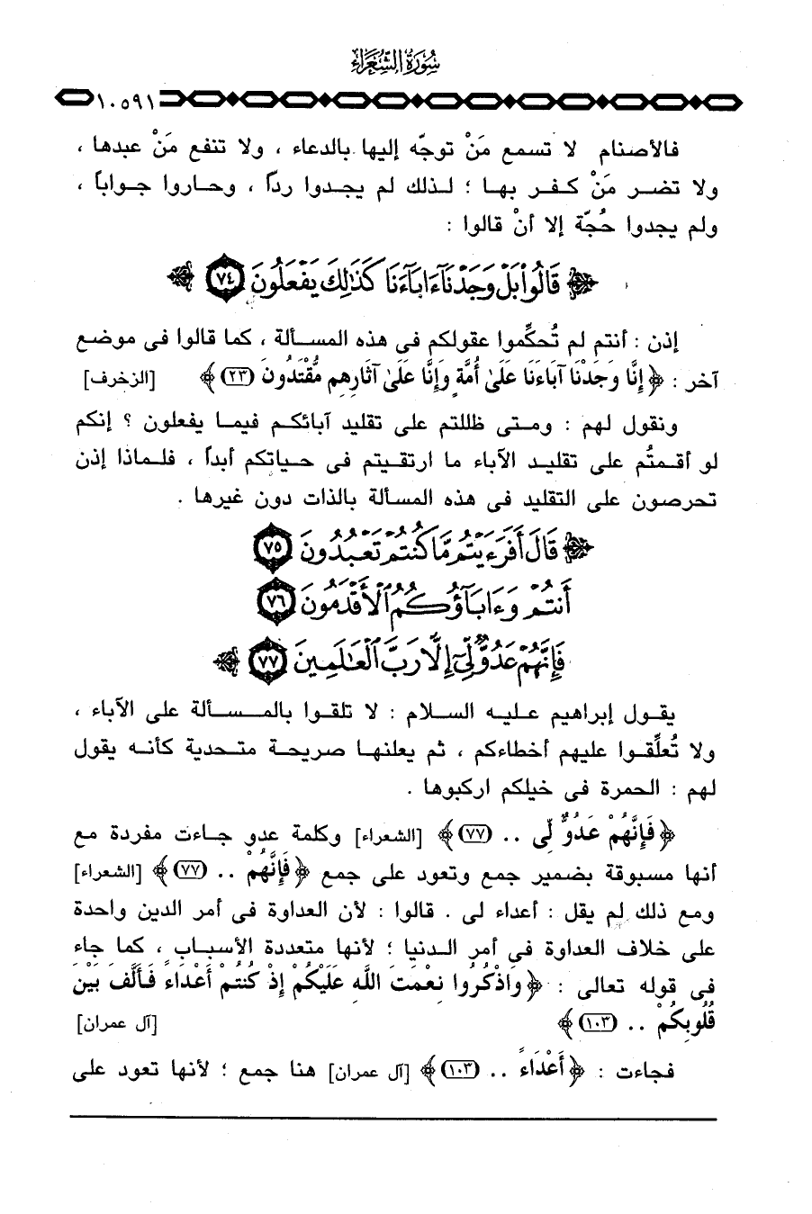{فَإِنَّهُمْ عَدُوٌّ لي} [الشعراء: 77] وكلمة عدو جاءت مفردة مع أنها مسبوقة بضمير جمع وتعود على جمع {فَإِنَّهُمْ} [الشعراء: 77] ومع ذلك لم يقل: أعداء لي. قالوا: لأن العداوة في أمر الدين واحدة على خلاف العداوة في أمر الدنيا؛ لأنها متعددة الأسباب، كما جاء في قوله تعالى: {واذكروا نِعْمَتَ الله عَلَيْكُمْ إِذْ كُنْتُمْ أَعْدَآءً فَأَلَّفَ بَيْنَ قُلُوبِكُمْ} [آل عمران: 103] .