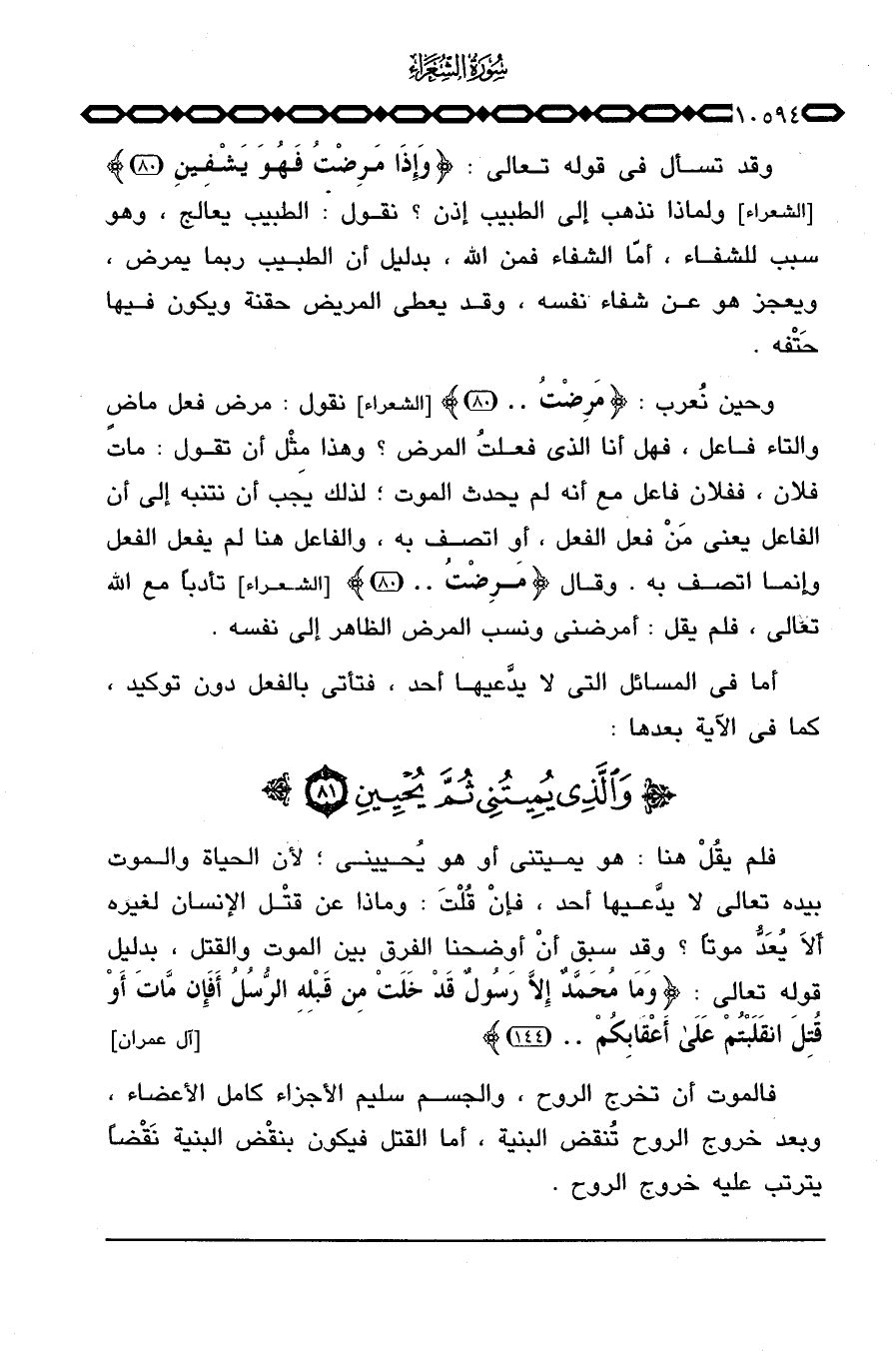 وحين نُعرب: {مَرِضْتُ} [الشعراء: 80] نقول: مرض فعل ماضٍ والتاء فاعل، فهل أنا الذي فعلتُ المرض؟ وهذا مِثْل أن نقول: مات فلان، ففلان عامل مع أنه لم يحدث الموت؛ لذلك يجب أن نتنبه إلى أن الفاعل يعني مَنْ فعل الفعل، أو اتصف به، والفاعل هنا لم يفعل الفعل وإنما اتصف به. وقال {مَرِضْتُ} [الشعراء: 80] تأدباً مع الله تعالى، فلم يقل: أمرضني ونسب المرض الظاهر إلى نفسه.