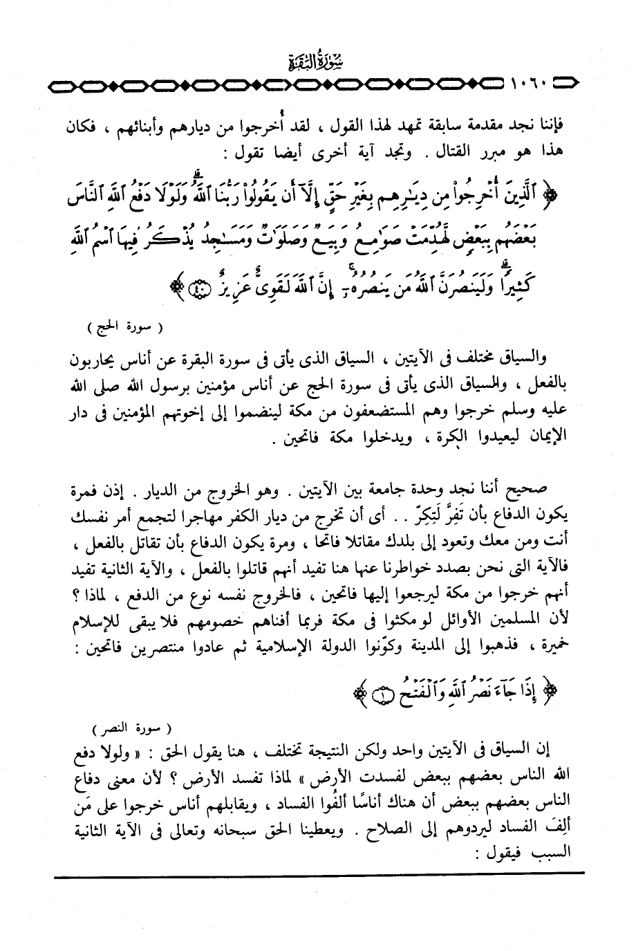 والسياق مختلف في الآيتين، السياق الذي يأتي في سورة البقرة عن أناس يحاربون بالفعل، والسياق الذي يأتي في سورة الحج عن أناس مؤمنين برسول الله صَلَّى اللَّهُ عَلَيْهِ وَسَلَّم َ خرجوا وهم المستضعفون من مكة لينضموا إلى أخوتهم المؤمنين في دار الإيمان ليعيدوا الكرة، ويدخلوا مكة فاتحين.