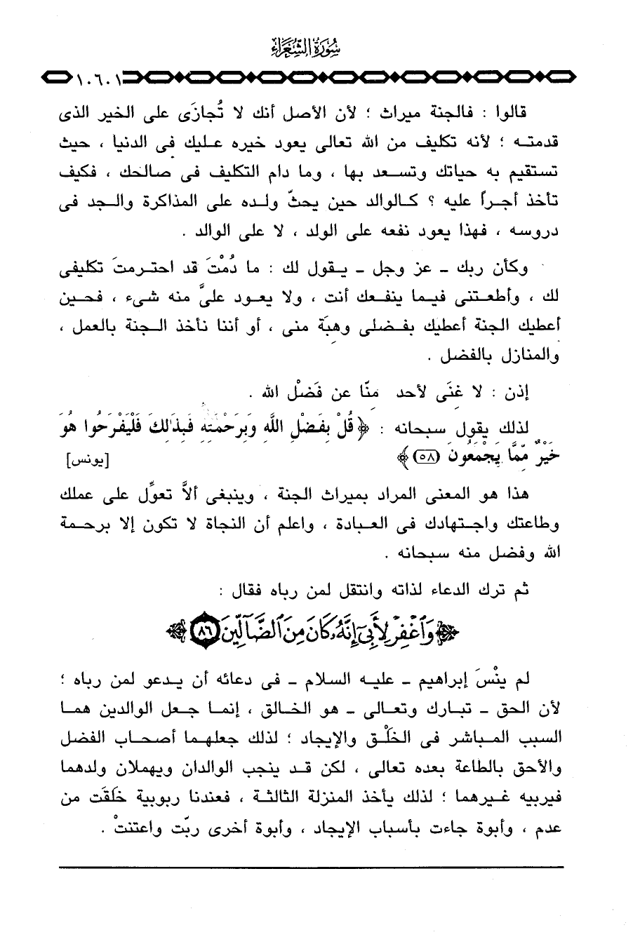 هذا هو المعنى المراد بميراث الجنة، وينبغي ألاَّ تعوِّل على عملك وطاعتك واجتهادك في العبادة، واعلم أن النجاة لا تكون إلا برحمة الله وفضل منه سبحانه.