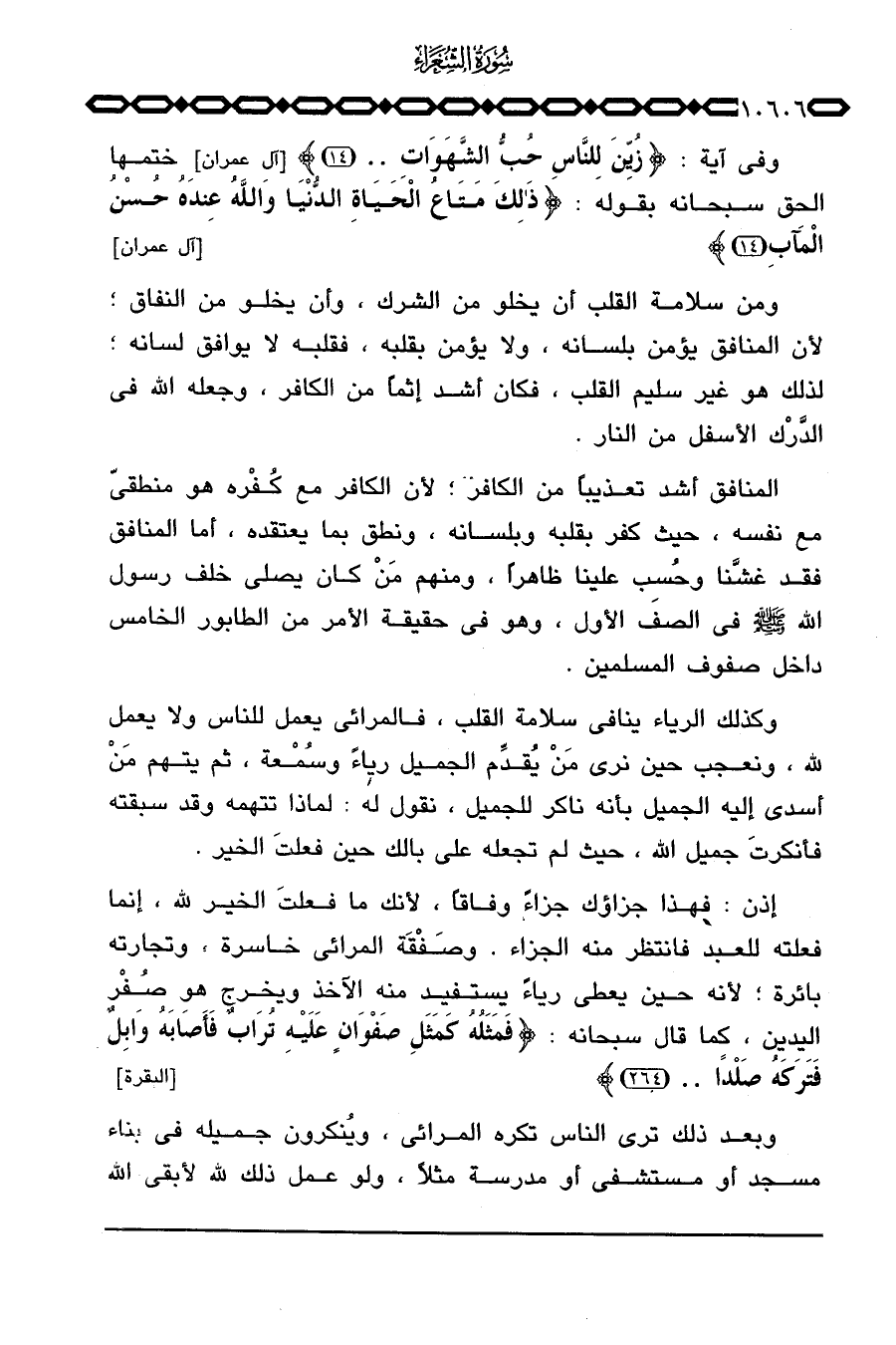 وكذلك الرياء ينافي سلامة القلب، فالمرائي يعمل للناس ولا يعمل لله، ونعجب حين نرى مَنْ يُقدِّم الجميل رياءً وسُمْعة، ثم يتهم مَنْ أسدى إليه الجميل بأنه ناكر للجميل، نقول له: لماذا تتهمه وقد سبقته فأنكرتَ جميل الله، حيث لم تجعله على بالك حين فعلتَ الخير.