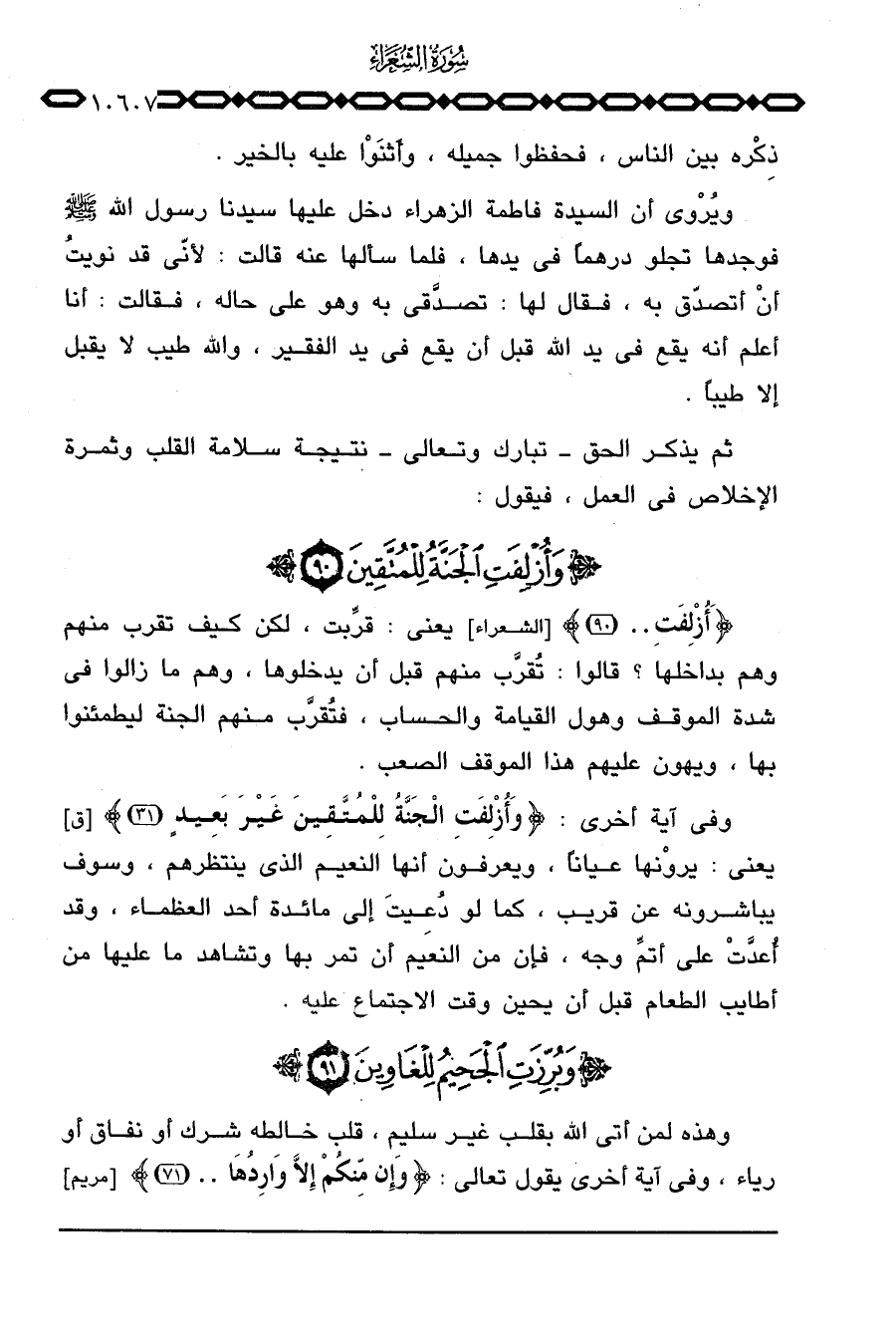 «ويُرْوى أن السيدة فاطمة الزهراء دخل عليها سيدنا رسول الله صَلَّى اللَّهُ عَلَيْهِ وَسَلَّم َ فوجدها تجلو درهماً في يدها، فلما سألها عنه قالت: لأنّي قد نويتُ أنْ أتصدّق به، فقال لها: تصدَّقي به وهو على حاله، فقالت: أنا أعلم أنه يقع في يد الله قبل أن يقع في يد الفقير، والله طيب لا يقبل إلا طيباً» .