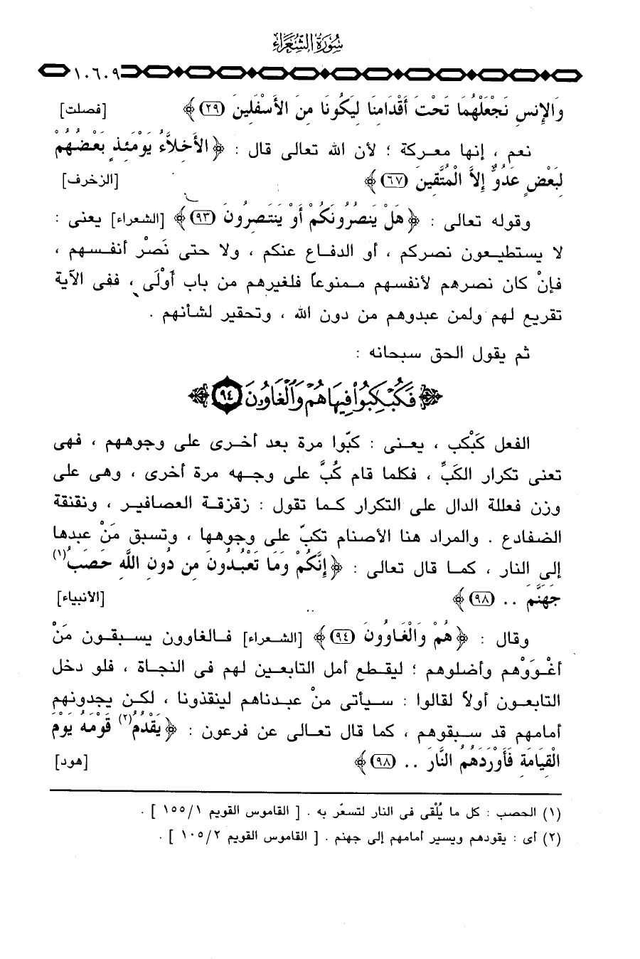 الفعل كَبْكب، يعني: كبّوا مرة بعد أخرى على وجوههم، فهي تعني تكرار الكَبِّ، فكلما قام كُبَّ على وجهه مرة أخرى، وهي على وزن فعللة الدال على التكرار كما تقول: زقزقة العصافير، ونقنقة الضفادع. والمراد هنا الأصنام تكبّ على وجوهها، وتسبق مَنْ عبدها إلى النار، كما قال تعالى: {إِنَّكُمْ وَمَا تَعْبُدُونَ مِن دُونِ الله حَصَبُ جَهَنَّمَ} [الأنبياء: 98] .