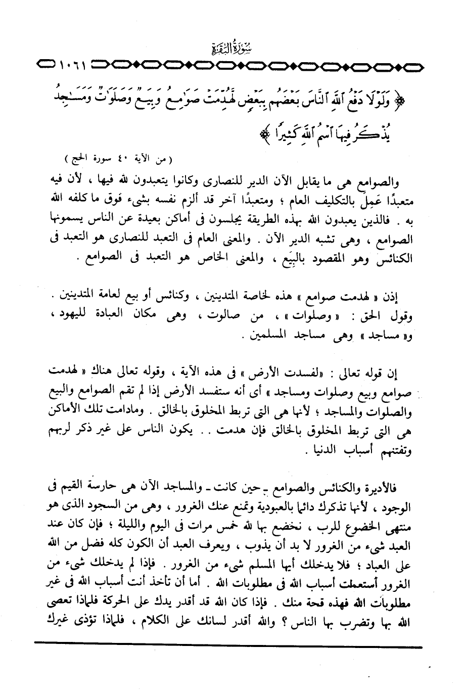 {وَلَوْلاَ دَفْعُ الله الناس بَعْضَهُمْ بِبَعْضٍ لَّهُدِّمَتْ صَوَامِعُ وَبِيَعٌ وَصَلَوَاتٌ وَمَسَاجِدُ يُذْكَرُ فِيهَا اسم الله كَثِيراً} [الحج: 40]