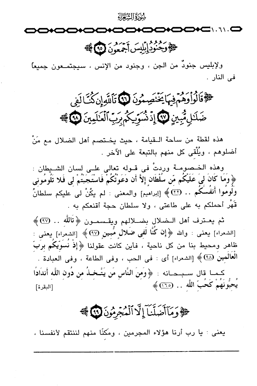 ثم يعترف أهل الضلال بضلالهم ويقسمون {تالله} [الشعراء: 97] يعني: والله {إِن كُنَّا لَفِي ضَلاَلٍ مُّبِينٍ} [الشعراء: 97] يعني: ظاهر ومحيط بنا من كل ناحية، فأين كانت عقولنا {إِذْ نُسَوِّيكُمْ بِرَبِّ العالمين} [الشعراء: 98] أي: في الحب، وفي الطاعة، وفي العبادة.