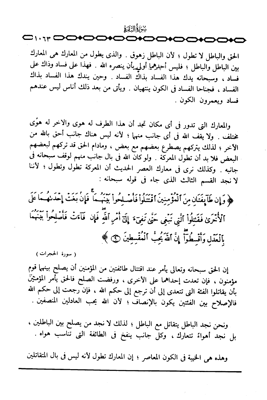 إن الحق سبحانه وتعالى يأمر عند اقتتال طائفتين من المؤمنين أن يصلح بينهما قوم مؤمنون، فإن تعدت إحداهما على الأخرى، ورفضت الصلح فالحق يأمر المؤمنين بأن يقاتلوا الفئة التي تتعدى إلى أن ترجع إلى حكم الله، فإن رجعت إلى حكم الله فالإصلاح بين الفئتين يكون بالإنصاف؛ لأن الله يحب العادلين المنصفين.