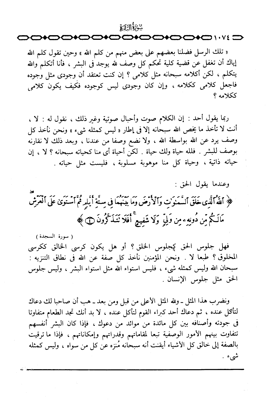 فهل جلوس الحق كجلوس الخلق؟ أو هل يكون كرسي الخالق ككرسي المخلوق؟ طبعا لا. ونحن المؤمنين نأخذ كل صفة عن الله في نطاق التنزيه: سبحان الله وليس كمثله شيء، فليس استواء الله مثل استواء البشر، وليس جلوس الحق مثل جلوس الإنسان.