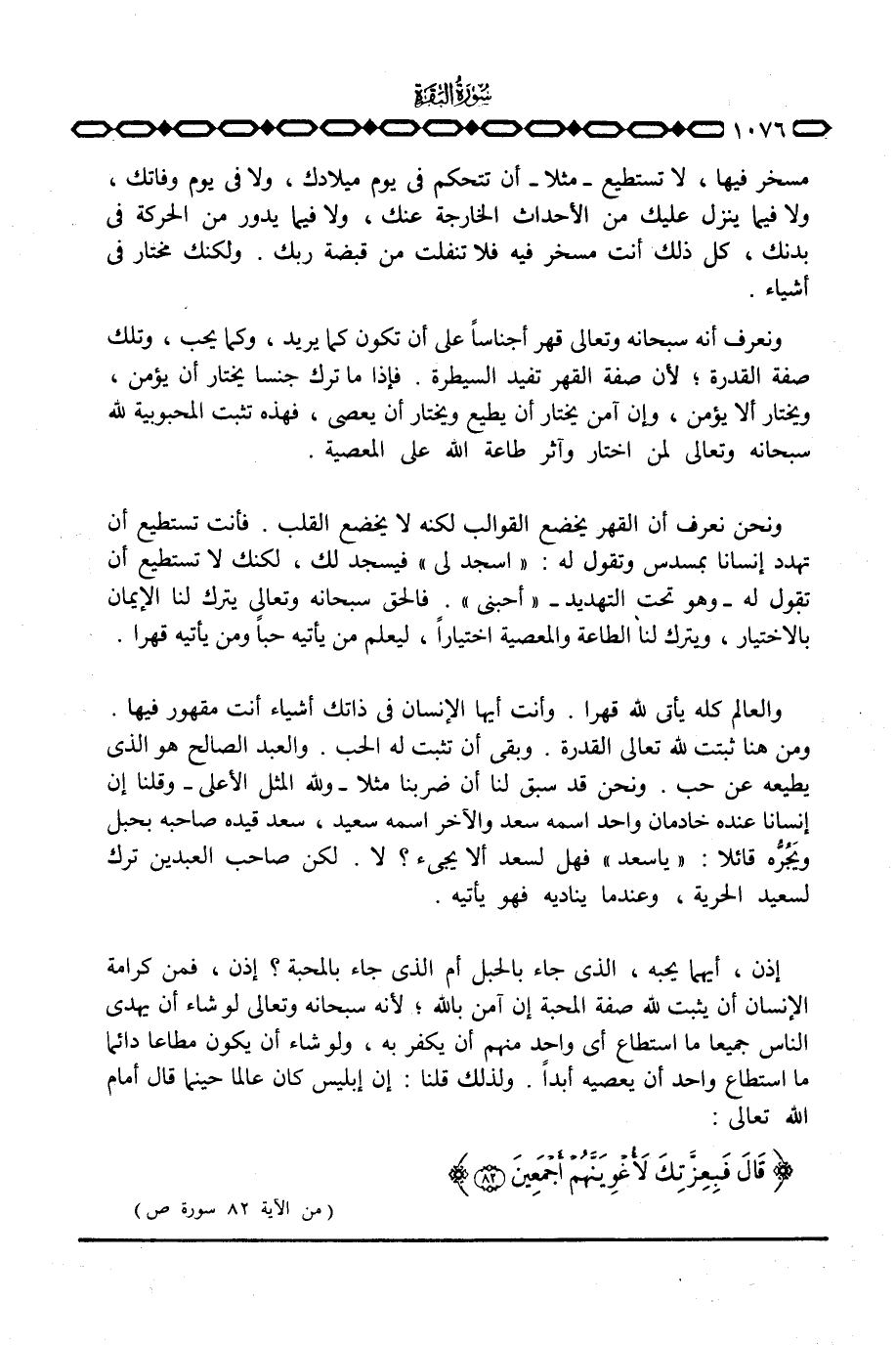 والعالم كله يأتي لله قهراً. وأنت أيها الإنسان في ذاتك أشياء أنت مقهور فيها. ومن هنا ثبتت لله تعالى القدرة. وبقى أن تثبت له الحب. والعبد الصالح هو الذي يطيعه عن حب. ونحن قد سبق لنا أن ضربنا مثلاً ولله المثل الأعلى وقلنا إن إنسانا عنده خادمان واحد اسمه سعد والآخر اسمه سعيد، سعد قيده صاحبه بحبل ويجره قائلا: «يا سعد» فهل لسعد ألا يجيء؟ لا.