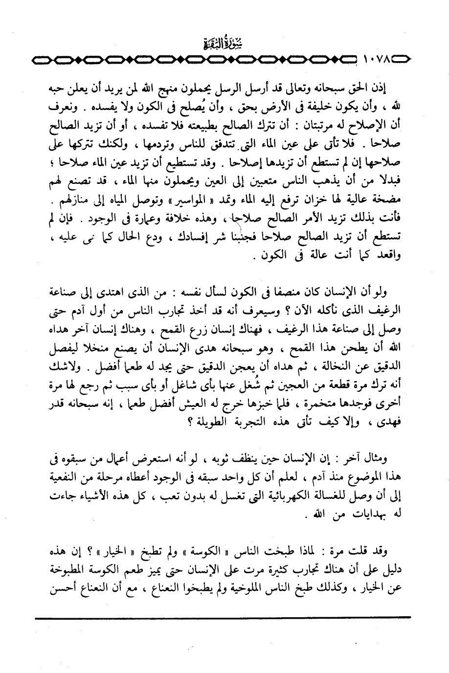 وقد تستطيع أن تزيد عين الماء صلاحاً؛ فبدلاً من أن يذهب الناس متعبين إلى العين ويحملون منها الماء، قد تصنع لهم مضخة عالية لها خزان ترفع إليه الماء وتمد «المواسير» وتوصل المياه إلى منازلهم. فأنت بذلك تزيد الأمر الصالح صلاحاً، وهذه خلافة وعمارة في الوجود. فإن لم تستطع أن تزيد الصالح صلاحاً فجنبنا شر إفسادك، ودع الحال كما هي عليه، واقعد كما أنت عالة في الكون.