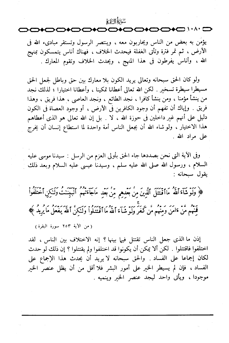 {وَلَوْ شَآءَ الله مَا اقتتل الذين مِن بَعْدِهِم مِّن بَعْدِ مَا جَآءَتْهُمُ البينات ولكن اختلفوا فَمِنْهُمْ مَّنْ آمَنَ وَمِنْهُمْ مَّن كَفَرَ وَلَوْ شَآءَ الله مَا اقتتلوا ولكن الله يَفْعَلُ مَا يُرِيدُ} [البقرة: 253]