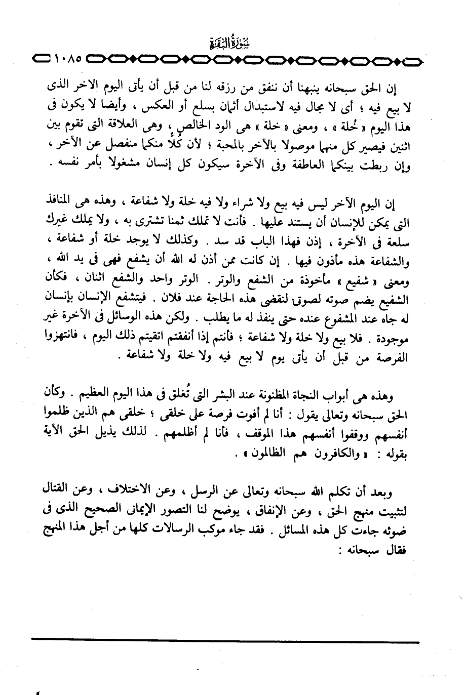 إن اليوم الآخر ليس فيه بيع ولا شراء ولا فيه خلة ولا شفاعة، وهذه هي المنافذ التي يمكن للإنسان أن يستند عليها. فأنت لا تملك ثمنا تشتري به، ولا يملك غيرك سلعة في الآخرة، إذن فهذا الباب قد سد. وكذلك لا يوجد خلة أو شفاعة، والشفاعة هذه مأذون فيها. إن كانت ممن أذن له الله أن يشفع فهي في يد الله، ومعنى «شفيع» مأخوذة من الشفع والوتر. الوتر واحد والشفع اثنان، فكأن الشفيع يضم صوته لصوتي لنقضي هذه الحاجة عند فلان. فيتشفع الإنسان بإنسان له جاه عند المشفوع عنده حتى ينفذ له ما يطلب. ولكن هذه الوسائل في الآخرة غير موجودة. فلا بيع ولا خلة ولا شفاعة؛ فأنتم إذا أنفقتم اتقيتم ذلك اليوم، فانتهزوا الفرصة من قبل أن يأتي يوم لا بيع فيه ولا خلة ولا شفاعة.