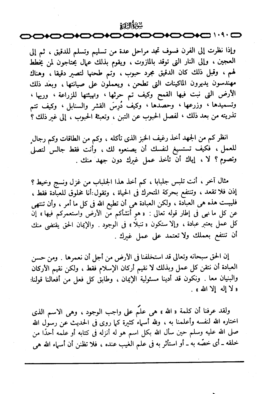مثال آخر، أنت تلبس جلبابا، كم أخذ هذا الجلباب من غزل ونسج وخيط؟ إذن فلا تقعد، وتنتفع بحركة المتحرك في الحياة، وتقول: أنا مخلوق للعبادة فقط، فليست هذه هي العبادة، ولكن العبادة هي أن تطيع الله في كل ما أمر، وأن تنتهي عن كل ما نهى في إطار قوله تعالى: {هُوَ أَنشَأَكُمْ مِّنَ الأرض واستعمركم فِيهَا} إن كل عمل يعتبر عبادة، وإلا ستكون «تنبلاً» في الوجود. والإيمان الحق يقتضي منك أن تنتفع بعملك ولا تعتمد على عمل غيرك.