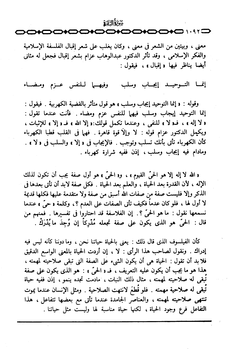 وقوله: «إنما التوحيد إيجاب وسلب» هو قول متأثر بالقضية الكهربية. فيقول: إنما التوحيد إيجاب وسلب فيهما للنفس عزم ومضاء. فأنت عندما تقول «لا إله» ، ف «لا» للنفي، وعندما تكمل قولك: «إلا الله» ف «إلا» للإثبات، ويكمل الدكتور عزام قوله: لا وإلا قوة قاهرة. فهما في القلب قطبا الكهرباء كأن الكهرباء تأتي بأنك تسلب وتوجب. فالإيجاب في «إلا» والسلب في «لا» . ومادام فيه إيجاب وسلب، إذن ففيه شرارة كهرباء.