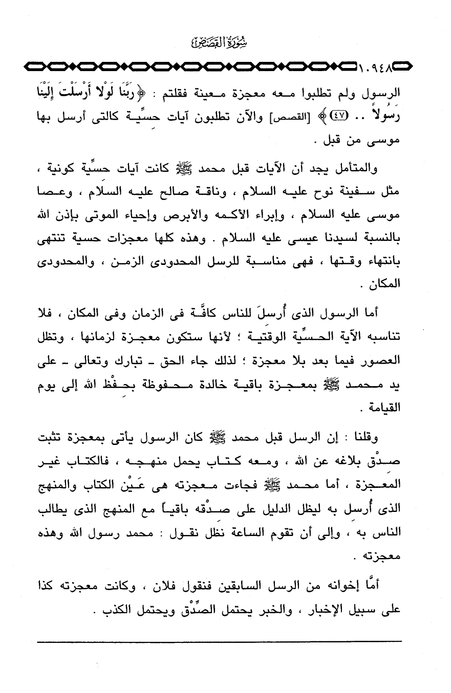 وقلنا: إن الرسل قبل محمد صَلَّى اللَّهُ عَلَيْهِ وَسَلَّم َ كان الرسول يأتي بمعجزة تثبت صِدْق بلاغه عن الله، ومعه كتاب يحمل منهجه، فالكتاب غير المعجزة، أما محمد صَلَّى اللَّهُ عَلَيْهِ وَسَلَّم َ فجاءت معجزته هي عَيْن الكتاب والمنهج الذي أُرسِل به ليظل الدليل على صِدْقه باقياً مع المنهج الذي يطالب الناس به، وإلى أن تقوم الساعة نظل نقول: محمد رسول الله معجزته هي عَيْن الكتاب والمنهج الذي أُرسل به ليظل الدليل على صِدقْه باقياً مع المنهج الذي يطالب الناس به، وإلى أن تقوم الساعة نظل نقول: محمد رسول الله وهذه معجزته.