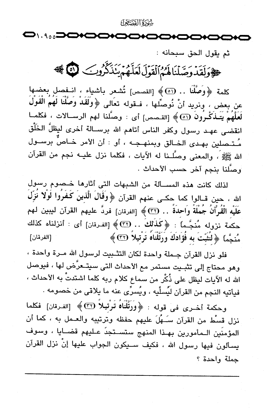 كلمة {وَصَّلْنَا. .} [القصص: 51] تُشعر بأشياء، انفصل بعضها عن بعض، ونريد أنْ نُوصِّلها، فقوله تعالى {وَلَقَدْ وَصَّلْنَا لَهُمُ القول لَعَلَّهُمْ يَتَذَكَّرُونَ} [القصص: 51] أي: وصَّلنا لهم الرسالات، فكلما انقضى عهد رسول وكفر الناس أتاهم الله برسالة أخرى ليظلَّ الخَلْق مُتصلِين بهدي الخالق وبمنهجه، أو: أن الأمر خاصٌّ برسول الله صَلَّى اللَّهُ عَلَيْهِ وَسَلَّم َ، والمعنى وصَّلنا له الآيات، فكلما نزل عليه نجم من القرآن وصَّلنا بنجم آخر حسب الأحداث.
