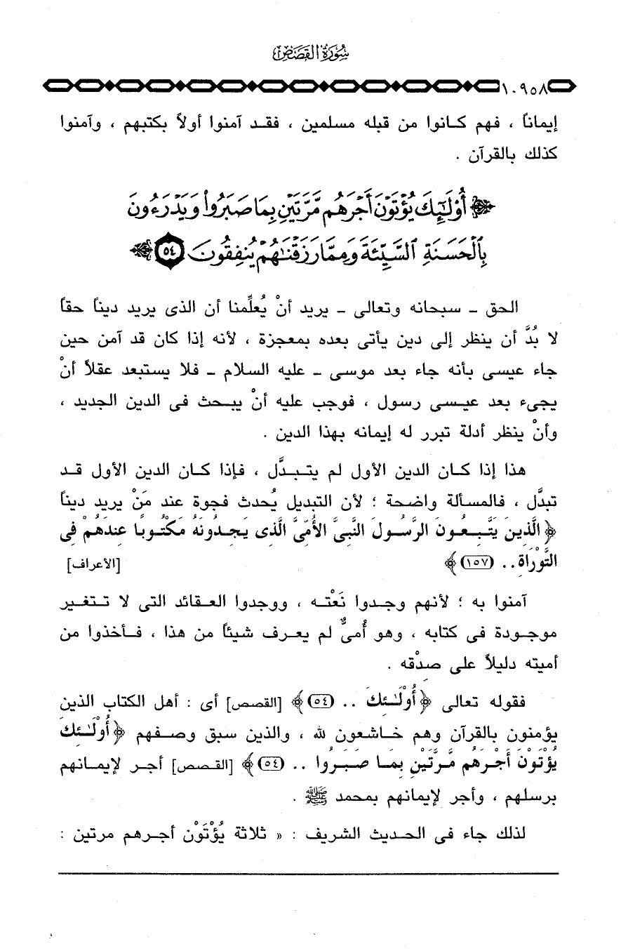 فقوله تعالى: {أولئك ... } [القصص: 54] أي: أهل الكتاب الذين يؤمنون بالقرآن وهم خاشعون لله، والذين سبق وصفهم {أولئك يُؤْتُونَ أَجْرَهُم مَّرَّتَيْنِ بِمَا صَبَرُواْ ... } [القصص: 54] أجر لإيمانهم برسلهم، وأجر لإيمانهم بمحمد صَلَّى اللَّهُ عَلَيْهِ وَسَلَّم َ.