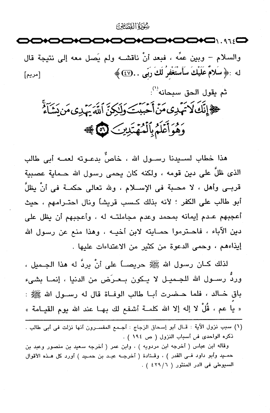 هذا خطاب لسيدنا رسول الله، خاصٌّ بدعوته لعمه أبي طالب الذي ظلَّ على دين قومه، ولكنه كان يحمي رسول الله حماية عصبية قربى وأهل، لا محبة في الإسلام، ولله تعالى حكمة في أنْ يظلَّ أبو طالب على الكفر؛ لأنه بذلك كسب قريشاً ونال احترامهم، حيث أعجبهم عدم إيمانه بمحمد وعدم مجاملته له، وأعجبهم أن يظل على دين الآباء، فاحترموا حمايته لابن أخيه، وهذا منع عن رسول الله إيذاءهم، وحمى الدعوة من كثير من الاعتداءات عليها.