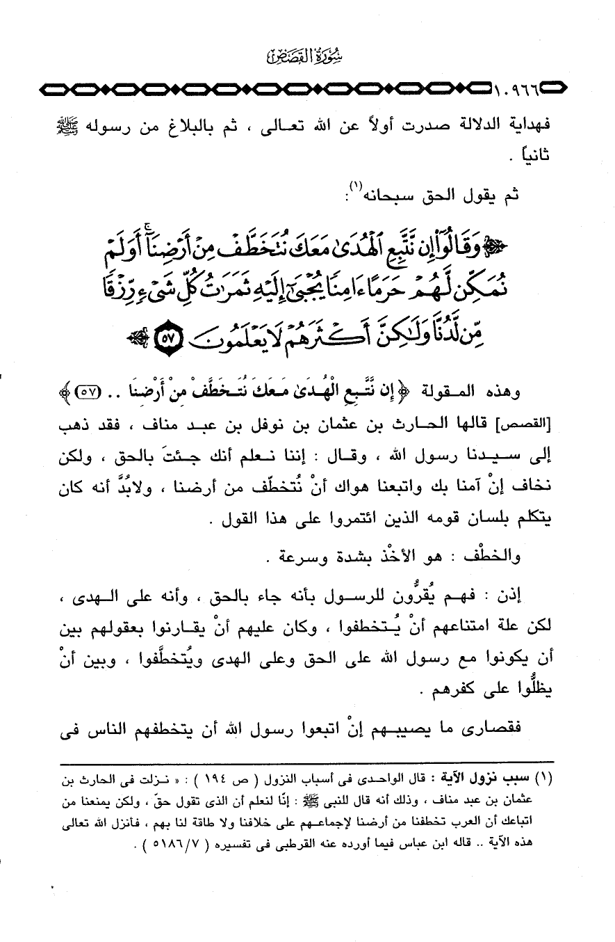 وهذه المقولة {إِن نَّتَّبِعِ الهدى مَعَكَ نُتَخَطَّفْ مِنْ أَرْضِنَآ ... } [القصص: 57] قالها الحارث بن عثمان بن نوفل بن عبد مناف، فقد ذهب إلى سيدنا رسول الله، وقال: إننا نعلم أنك جئتَ بالحق، ولكن نخاف إنْ آمنا بك واتبعنا هواك أنْ نُتخطّف من أرضنا، ولا بُدَّ أنه كان يتكلم بلسان قومه الذين ائتمروا على هذا القول.
