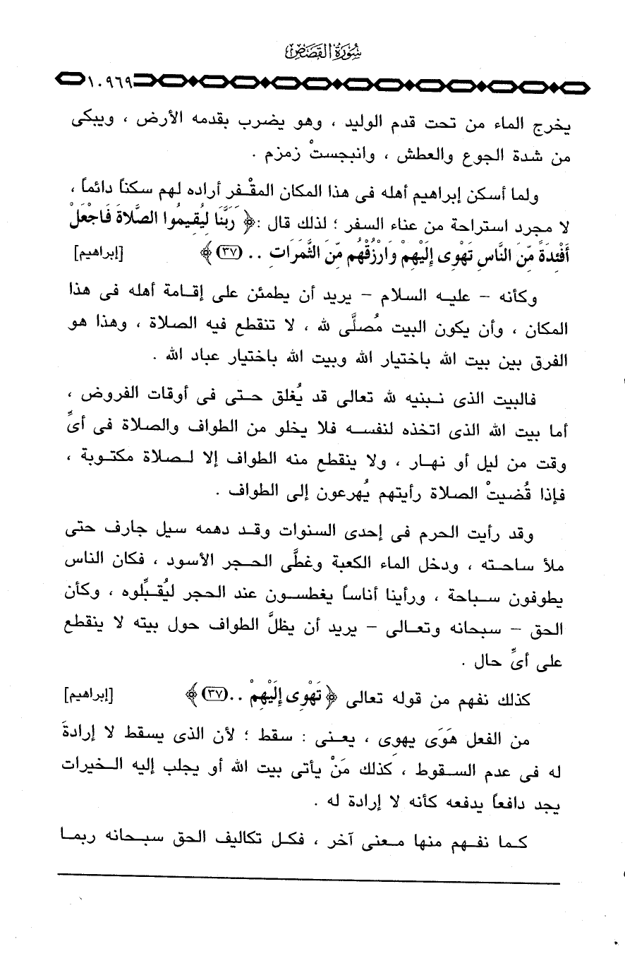 فالبيت الذي نبنيه لله تعالى قد يُغلق حتى في أوقات الفروض، أما بيت الله الذي اتخذه لنفسه فلا يخلو من الطواف والصلاة في أيِّ وقت من ليل أو نهار، ولا ينقطع منه الطواف إلا لصلاة مكتوبة، فإذا قُضيتْ الصلاة رأيتهم يُهرعون إلى الطواف.