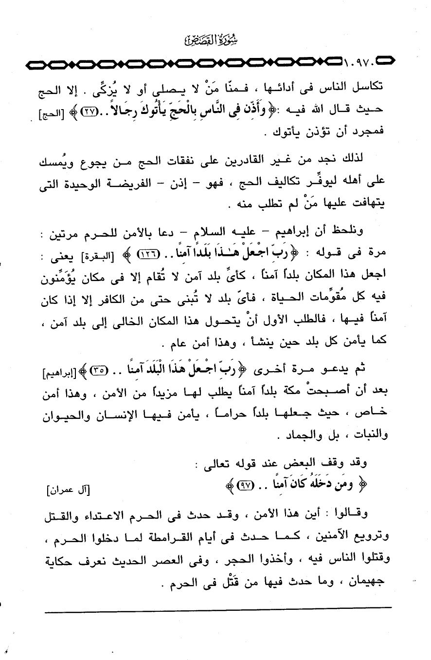 ونلحظ أن إبراهيم - عليه السلام - دعا بالأمن للحرم مرتين: مرة في قوله: {رَبِّ اجعل هذا بَلَداً آمِناً ... } [البقرة: 126] يعني: اجعل هذا المكان بلداً آمناً، كأيِّ بلد آمن لا تُقام إلا في مكان يُؤَمِّنون فيه كل مُقوِّمات الحياة، فأيّ بلد لا تُبنى حتى من الكافر إلا إذا كان آمناً فيها، فالطلب الأول أنْ يتحول هذا المكان الخالي إلى بلد آمن، كما يأمن كل بلد حين ينشأ، وهذا أمن عام.
