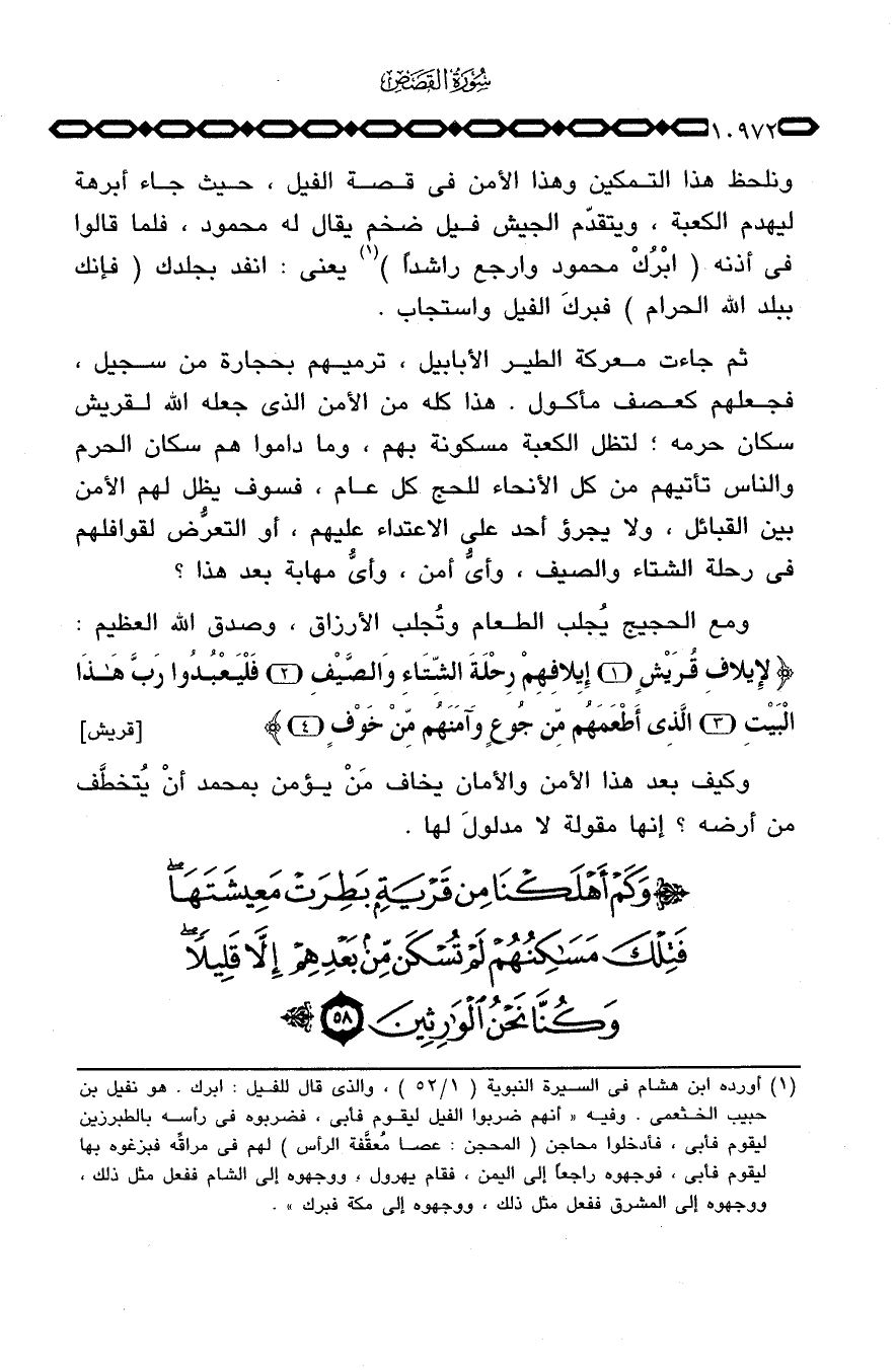 ثم جاءت معركة الطير الأبابيل، ترميهم بحجارة من سجيل، فجعلهم كعصف مأكول. هذا كله من الأمن الذي جعله الله لقريش فجعلهم كعصف مأكول. هذا كله من الأمن الذي جعله الله لقريش سكان حرمه؛ لتظل الكعبة مسكونة بهم، وما داموا هم سكان الحرم والناس تأتيهم من كل الأنحاء للحج كل عام، فسوف يظل لهم الأمن بين القبائل، ولا يجرؤ أحد على الأعتداء عليهم، أو التعرُّض لقوافلهم في رحلة الشتاء والصيف، وأيُّ أمن، وأيُّ مهابة بعد هذا؟