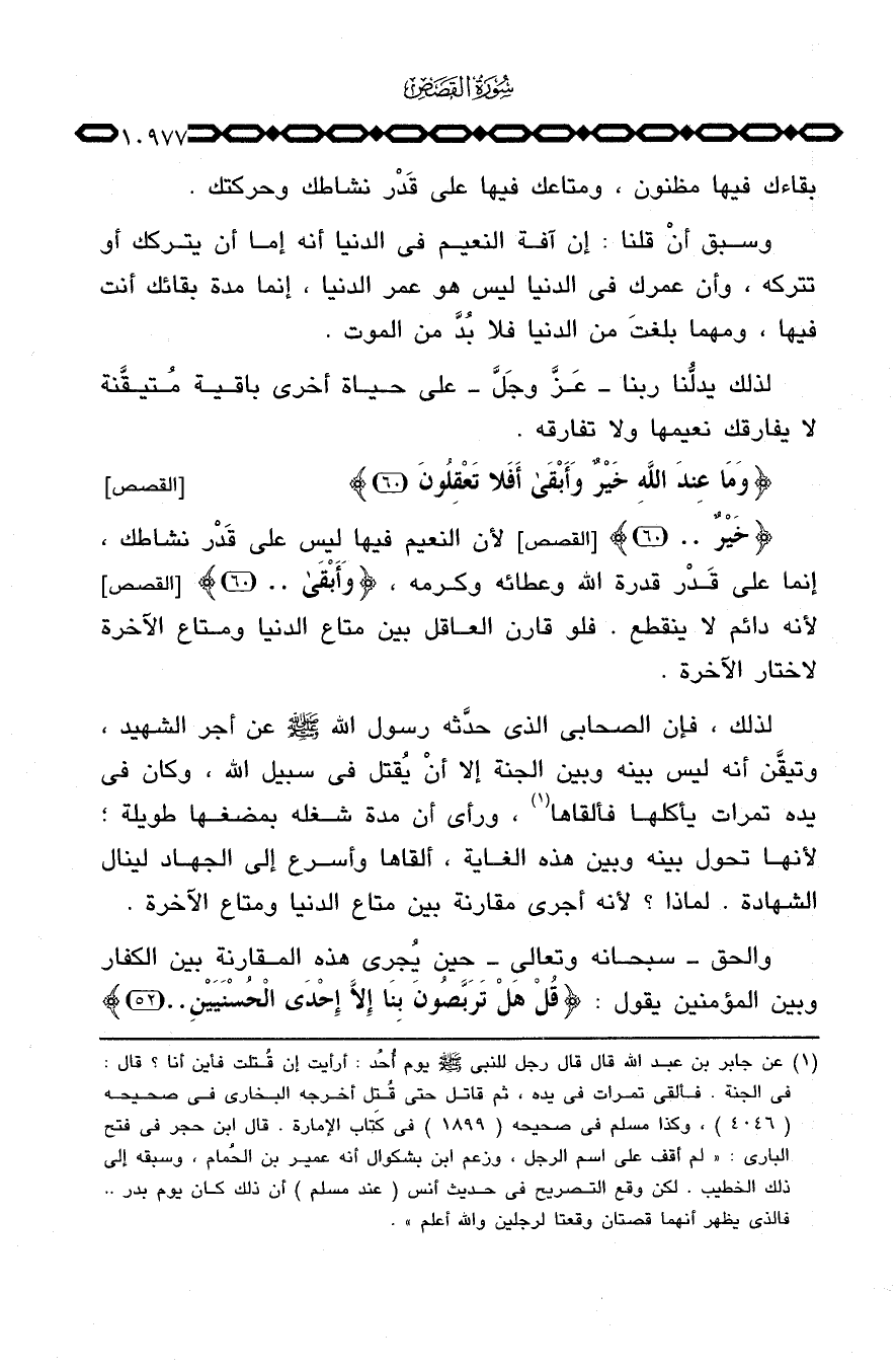 لذلك، فإن الصحابي الذي حدَّثه رسول الله صَلَّى اللَّهُ عَلَيْهِ وَسَلَّم َ عن أجر الشهيد، وتيقَّن أنه ليس بينه وبين الجنة إلا أنْ يُقتل في سبيل الله، وكان في يده تمرات يأكلها فألقاها، ورأى أن مدة شغله بمضغها طويلة؛ لأنها تحول بينه وبين هذه الغاية، ألقاها وأسرع إلى الجهاد لينال الشهادة. لماذا؟ لأنه أجرى مقارنة بين متاع الدنيا ومتاع الآخرة.