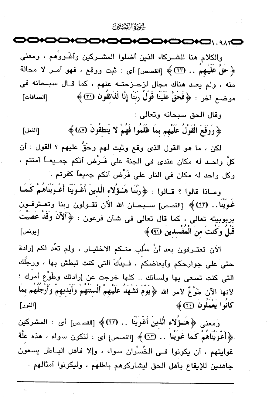 والكلام هنا للشركاء الذين أضلوا المشركين وأغَووْهم، ومعنى {حَقَّ عَلَيْهِمُ ... } [القصص: 63] أي: ثبت ووقع، فهو أمر لا محالة منه، ولم يعد هناك مجال لزحزحته عنهم، كما قال سبحانه في موضع آخر: {فَحَقَّ عَلَيْنَا قَوْلُ رَبِّنَآ إِنَّا لَذَآئِقُونَ} [الصافات: 31] .