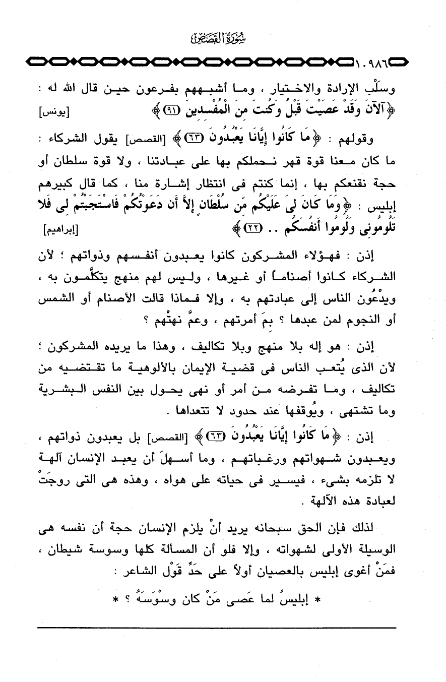 وقولهم: {مَا كانوا إِيَّانَا يَعْبُدُونَ} [القصص: 63] يقول الشركاء: ما كان معنا قوة قهر نحملكم بها على عبادتنا، ولا قوة سلطان أو حجة نقنعكم بها، إنما كنتم في انتظار إشارة منا، كما قال كبيرهم إبليس: {وَمَا كَانَ لِيَ عَلَيْكُمْ مِّن سُلْطَانٍ إِلاَّ أَن دَعَوْتُكُمْ فاستجبتم لِي فَلاَ تَلُومُونِي ولوموا أَنفُسَكُمْ ... } [إبراهيم: 22] .