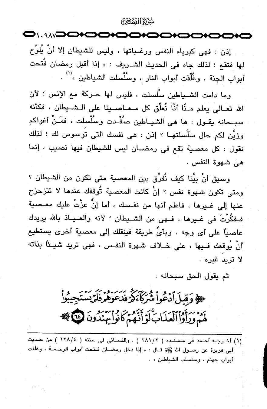 وما دامت الشياطين سُلسلت، فليس لها حركة مع الإنس؛ لأن الله تعالى يعلم منّا أنَّا نُعلِّق كل معاصينا على الشيطان، فكأنه سبحانه يقول: ها هي الشياطين صُفِّدت وسُلْسِلت، فمَنْ أغواكم وزيِّن لكم حال سَلْسلتها؟ إذن: هي نفسك التي تَوسوس لك؛ لذلك نقول: كل معصية تقع في رمضان ليس للشيطان فيها نصيب، إنما هي شهوة النفس.