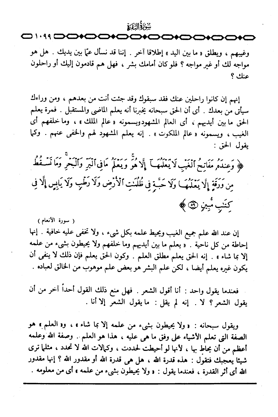ويقول سبحانه: {وَلاَ يُحِيطُونَ بِشَيْءٍ مِّنْ عِلْمِهِ إِلاَّ بِمَا شَآءَ} ، و «العلم» هو الصفة التي تعلم الأشياء على وفق ما هي عليه، هذا هو العلم. وصفة الله وعلمه أعظم من أن يحاط بهم، لأنها لو أحيطت لحددت، وكمالات الله لا تحدد، مثلما ترى شيئا يعجبك فتقول: هذه قدرة الله، هل هي قدرة الله أو مقدور الله؟ إنها مقدور الله أي أثر القدرة، فعندما يقول: {وَلاَ يُحِيطُونَ بِشَيْءٍ مِّنْ عِلْمِهِ إِلاَّ بِمَا شَآءَ} أي من معلومه.