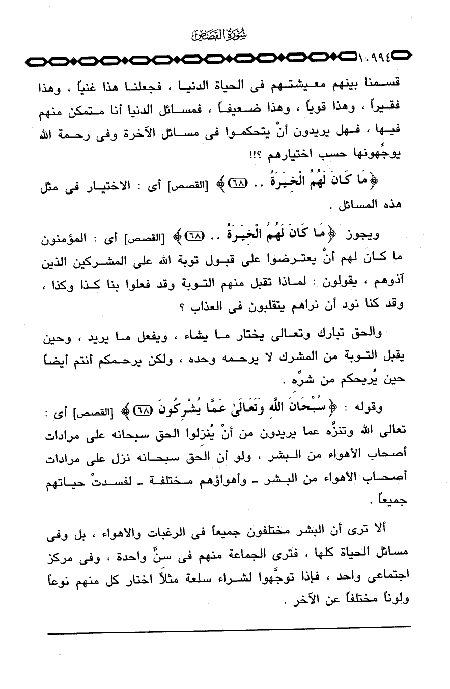 وقوله: {سُبْحَانَ الله وتعالى عَمَّا يُشْرِكُونَ} [القصص: 68] أي: تعالى الله وتنزَّه عما يريدون من أنْ يُنزِلوا الحق سبحانه على مرادات أصحاب الأهواء من البشر، ولو أن الحق سبحانه نزل على مرادات أصحاب الأهواء من البشر - وأهواؤهم مختلفة - لفسدتْ حياتهم جميعاً.