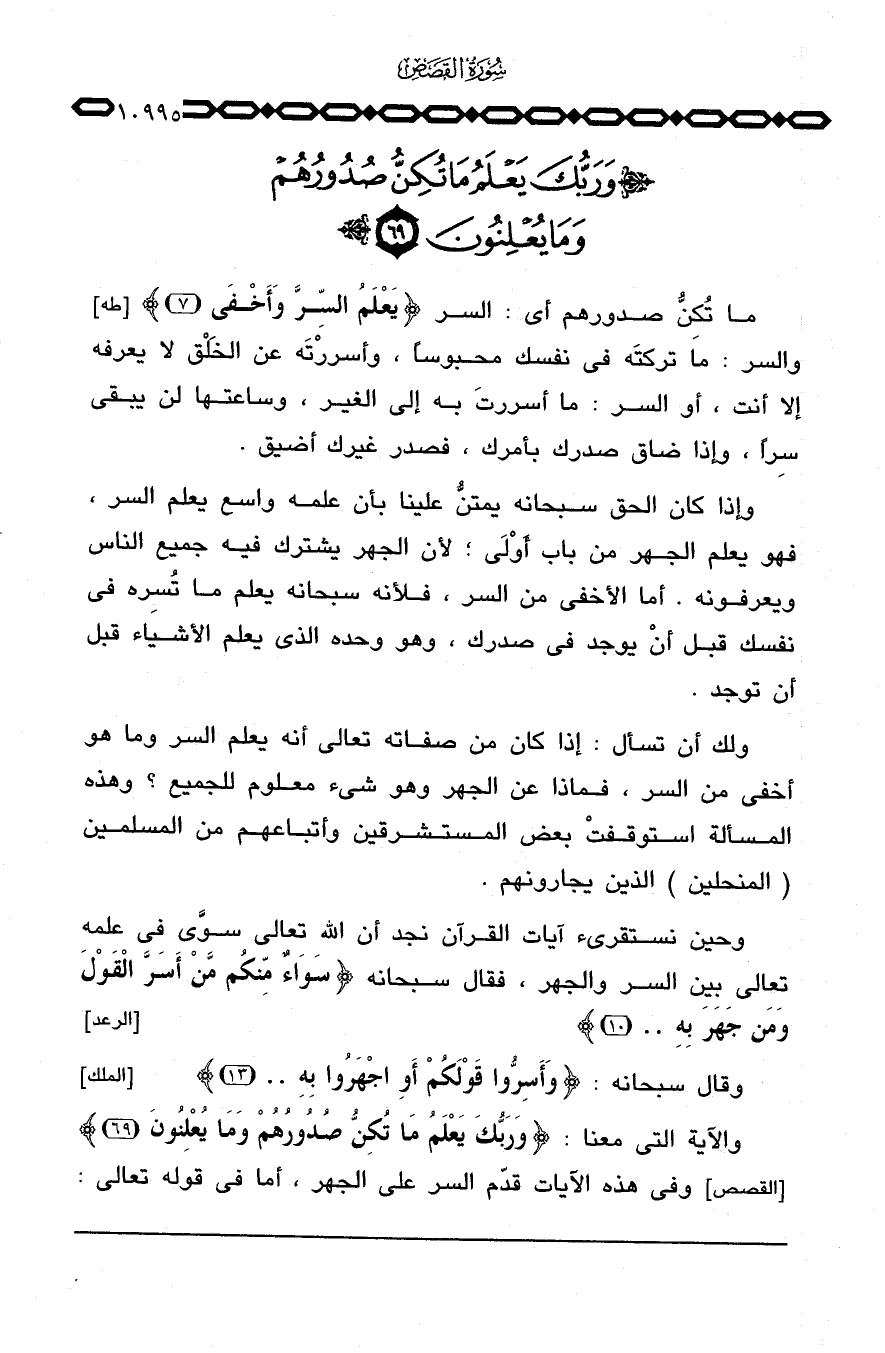والآية التي معنا: {وَرَبُّكَ يَعْلَمُ مَا تُكِنُّ صُدُورُهُمْ وَمَا يُعْلِنُونَ} [القصص: 69] وفي هذه الآيات قدّم السر على الجهر، أما في قوله تعالى: