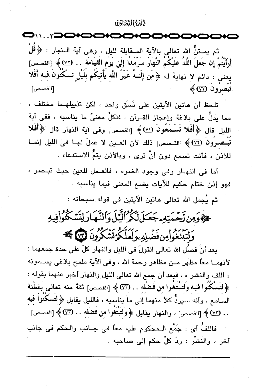ثم يمتنُّ الله تعالى بالآية المقابلة لليل، وهي آية النهار: {قُلْ أَرَأَيْتُمْ إِن جَعَلَ الله عَلَيْكُمُ الليل سَرْمَداً إلى يَوْمِ القيامة ... } [القصص: 72] يعني: دائم لا نهاية له {مَنْ إله غَيْرُ الله يَأْتِيكُمْ بِلَيْلٍ تَسْكُنُونَ فِيهِ أَفلاَ تُبْصِرُونَ} [القصص: 72] .
