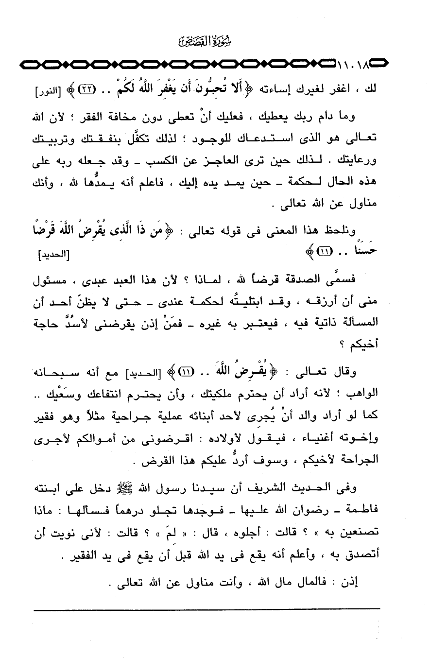 «وفي الحديث الشريف أن سيدنا رسول الله صَلَّى اللَّهُ عَلَيْهِ وَسَلَّم َ دخل على ابنته فاطمة - رضوان الله عليها - فوجدها تجلو درهماً فسألها: ماذا تصنعين به» ؟ قالت: أجلوه، قال: «لِمَ» ؟ قالت: لأني نويت أن أتصدق به، وأعلم أنه يقع في يد الله قبل أن يقع في يد الفقير «.