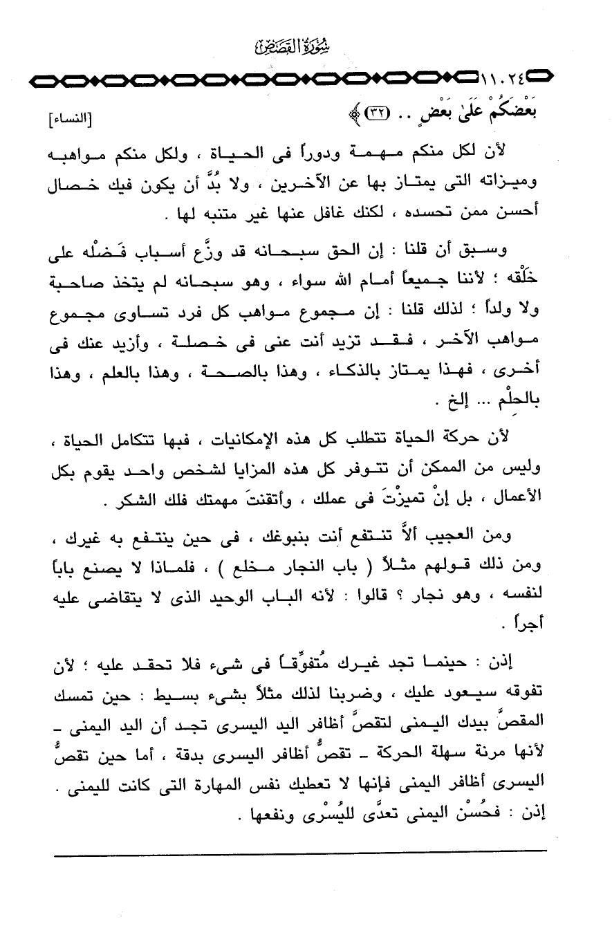إذن: حينما تجد غيرك مُتفوِّقاً في شيء فلا تحقد عليه؛ لأن تفوقه سيعود عليك، وضربنا لذلك مثلاً بشيء بسيط؛ حين تمسك المقصَّ بيدك اليمنى لتقصَّ أظافر اليد اليسرى تجد أن اليد اليمنى - لأنها مرنة سهلة الحركة - تقصُّ أظافر اليسرى بدقة، أما حين تقصُّ اليسرى أظافر اليمنى فإنها لا تعطيك نفس المهارة التي كانت لليمنى. إذن: فحُسْن اليمنى تعدَّى لليُسْرى ونفعها.
