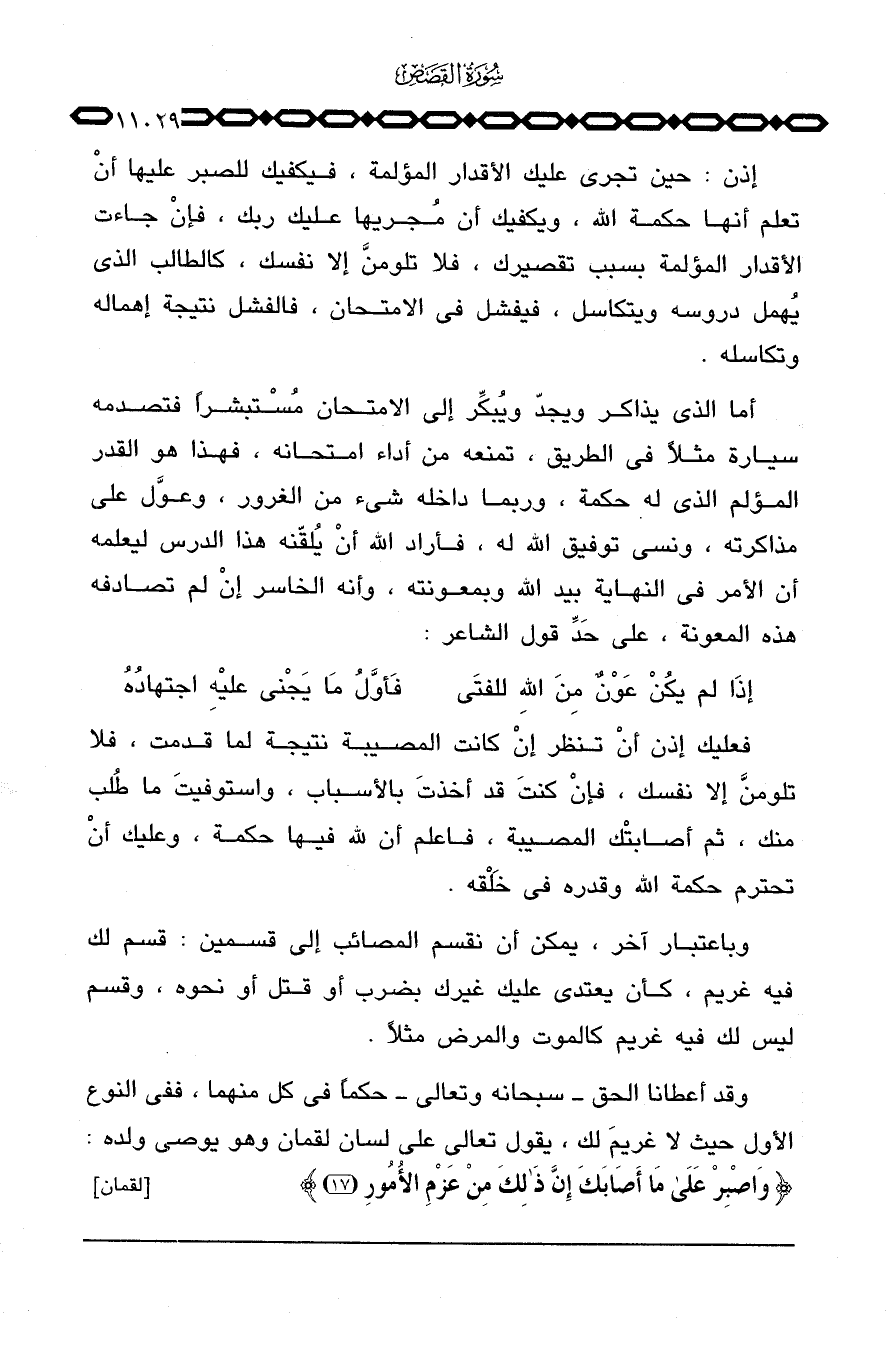 إذن: حين تجري عليك الأقدار المؤلمة، فيكفيك للصبر عليها أنْ تعلم أنها حكمة الله، ويكفيك أن مُجريها عليك ربك، فإنْ جاءت الأقدار المؤلمة بسبب تقصيرك، فلا تلومنَّ إلا نفسك، كالطالب الذي يُهمل دروسه ويتكاسل، فيفشل في الامتحان، فالفشل نتيجة إهماله وتكاسله.