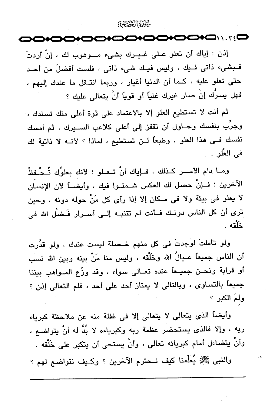 ولو تأملت لوجدتَ في كل منهم خصلة ليست عندك، ولو قدَّرت أن الناس جميعاً عيالُ الله وخَلْقه، وليس منا مَنْ بينه وبين الله نسب أو قرابة ونحن جميعاً عنده تعالى سواء، وقد وزّع المواهب بيننا جميعاً بالتساوي، وبالتالي لا يمتاز أحد على أحد، فلم التعالي إذن؟ ولِمَ الكبر؟
