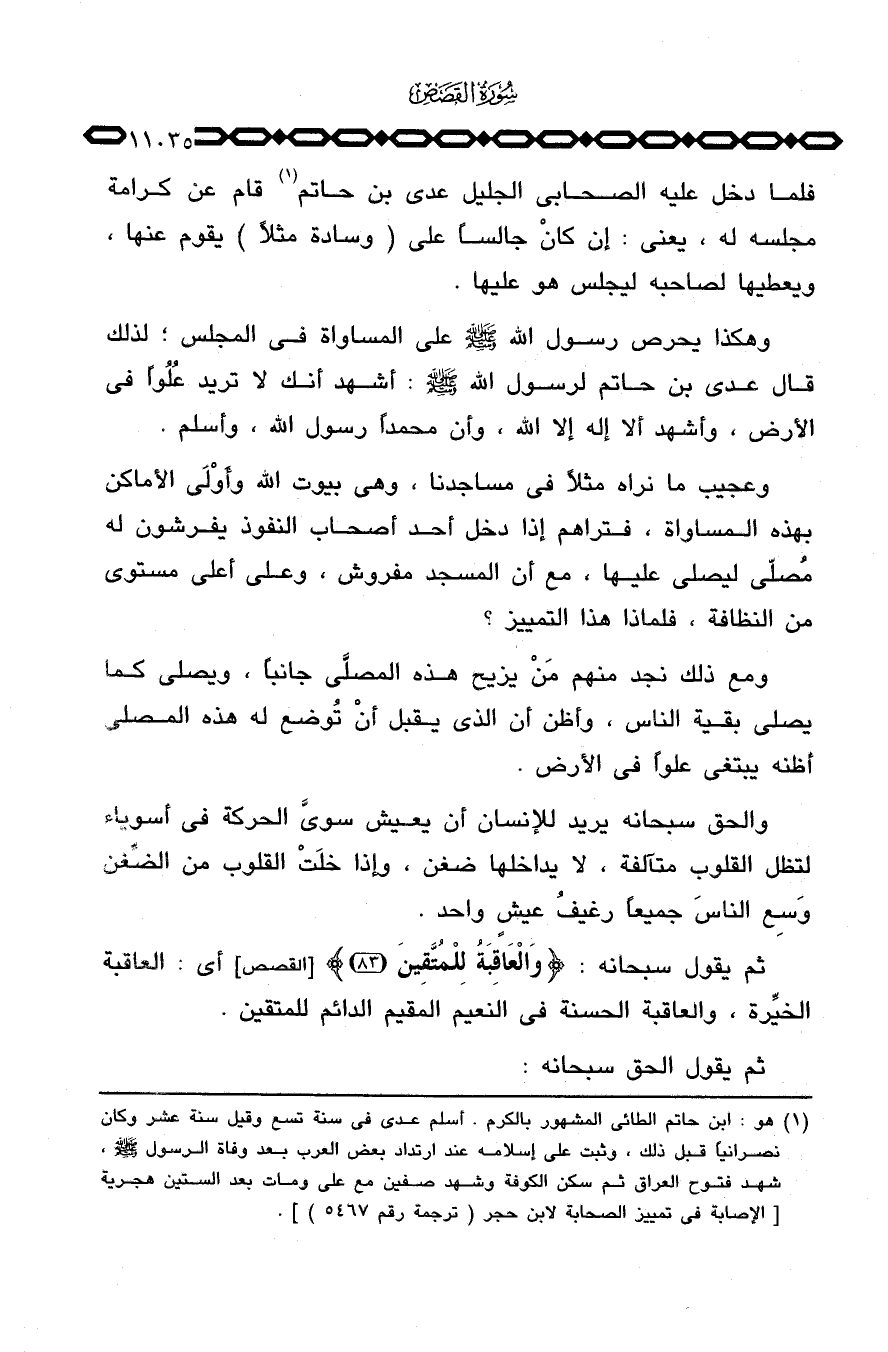 وهكذا يحرص رسول الله صَلَّى اللَّهُ عَلَيْهِ وَسَلَّم َ على المساواة في المجلس؛ لذلك قال عدي بن حاتم لرسول الله صَلَّى اللَّهُ عَلَيْهِ وَسَلَّم َ: أشهد أنك لا تريد عُلُواً في الأرض، وأشهد ألا إله إلا الله، وأن محمداً رسول الله، وأسلم.