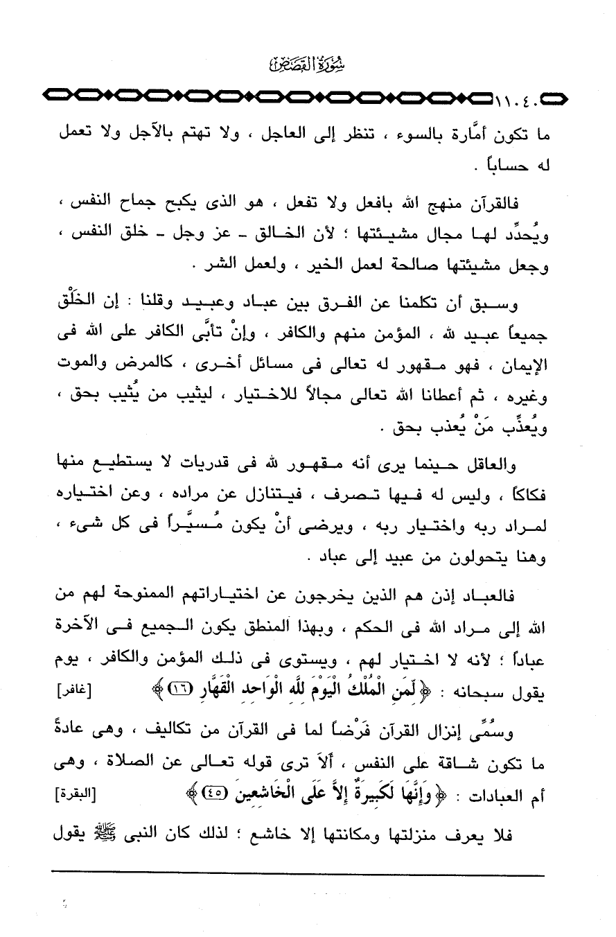 فالقرآن منهج الله بافعل ولا تفعل، هو الذي يكبح جماح النفس، ويُحدِّد لها مجال مشيئتها؛ لأن الخالق - عَزَّ وَجَلَّ - خلق النفس، وجعل مشيئتها صالحة لعمل الخير، ولعمل الشر.