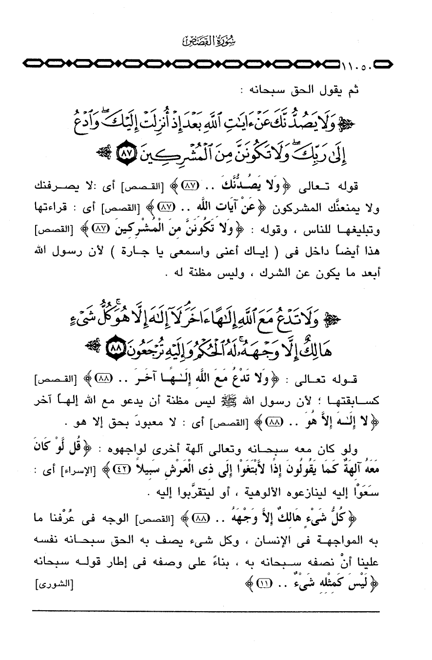قوله تعالى: {وَلاَ تَدْعُ مَعَ الله إلها آخَرَ ... } [القصص: 88] كسابقتها؛ لأن رسول الله صَلَّى اللَّهُ عَلَيْهِ وَسَلَّم َ ليس مظنة أن يدعو مع الله إلهاً آخر {لاَ إله إِلاَّ هُوَ ... } [القصص: 88] أي: لا معبودَ بحق إلا هو.