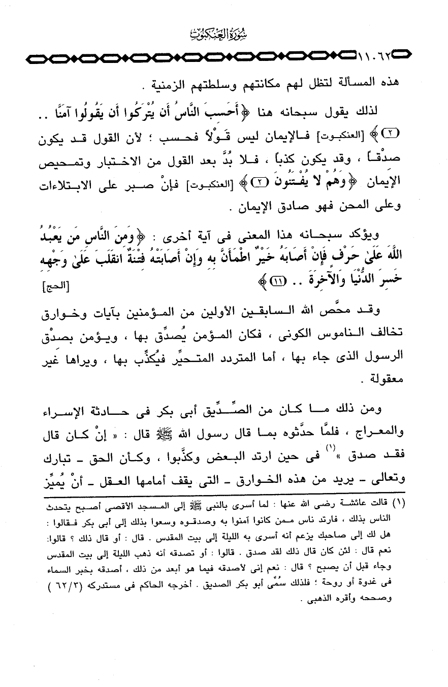 «ومن ذلك ما كان من الصِّدِّيق أبي بكر في حادثة الإسراء والمعراج، فلمَّا حدَّثوه بما قال رسول الله صَلَّى اللَّهُ عَلَيْهِ وَسَلَّم َ قال:» إنْ كان قال فقد صدق «في حين ارتد البعض وكذَّبوا، وكأن الحق - تبارك وتعالى - يريد من هذه الخوارق، التي يقف أمامها العقل - أنْ يُميِّز