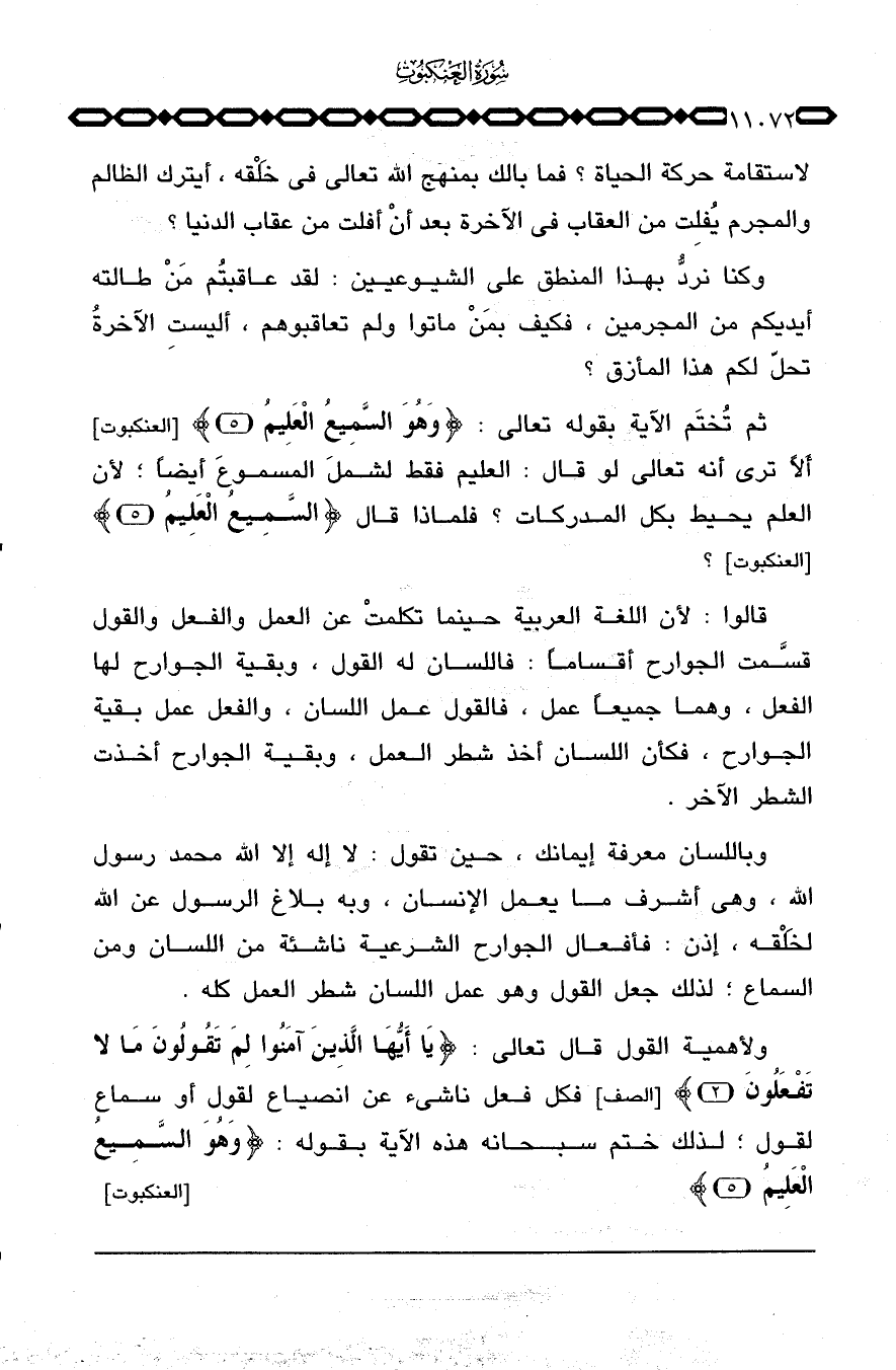 ولأهمية القول قال تعالى: {ياأيها الذين آمَنُواْ لِمَ تَقُولُونَ مَا لاَ تَفْعَلُونَ} [الصف: 2] فكل فعل ناشيء عن انصياع لقول أو سماع لقول؛ لذلك ختم سبحانه هذه الآية بقوله: {وَهُوَ السميع العليم} [العنكبوت: 5] .