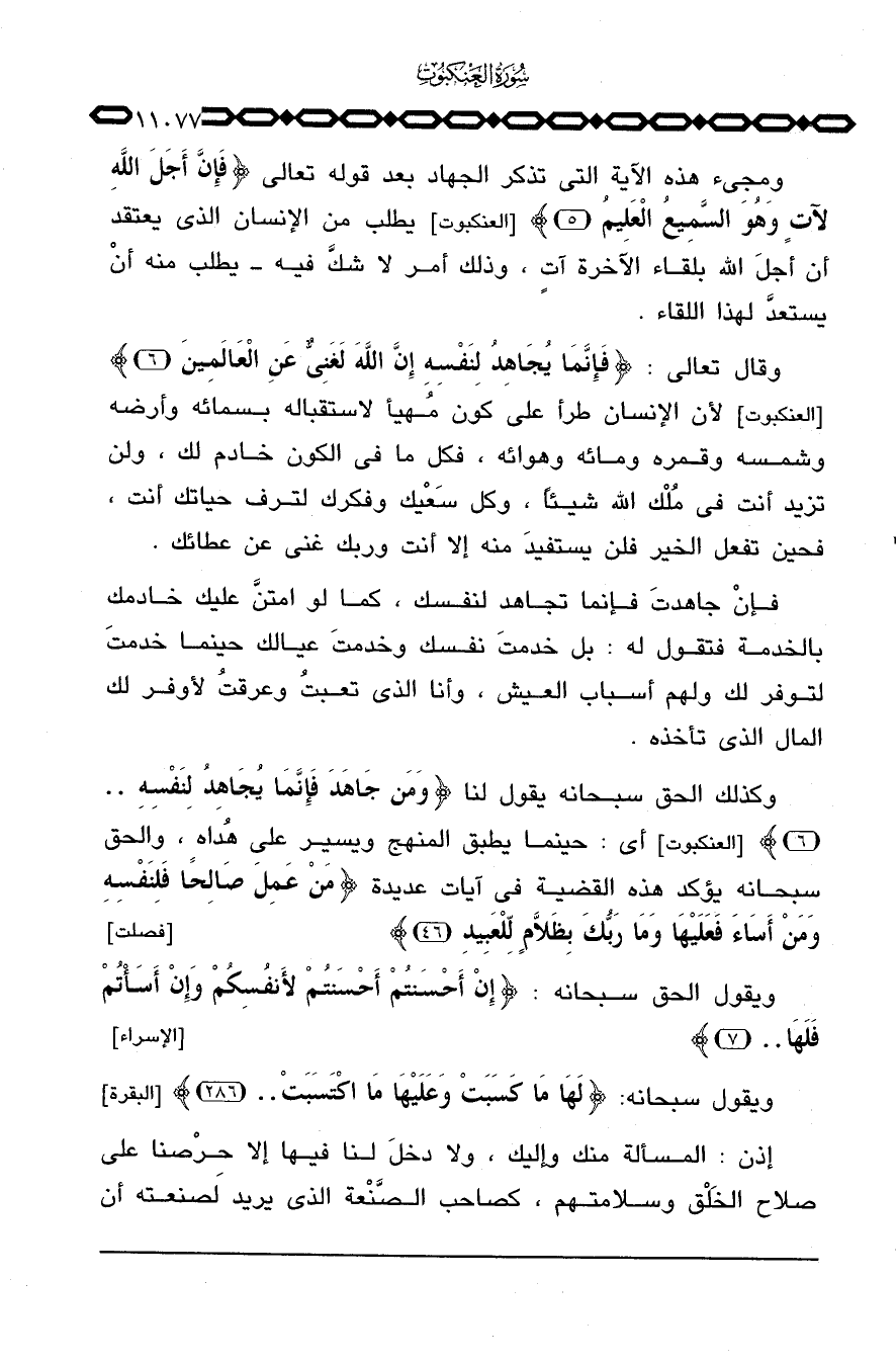 فإنْ جاهدتَ فإنما تجاهد لنفسك، كما لو امتنَّ عليك خادمك بالخدمة فتقول له: بل خدمتَ نفسك وخدمتَ عيالك حينما خدمتَ لتوفر لك ولهم أسباب العيش، وأنا الذي تعبتُ وعرقتُ لأوفر لك المال الذي تأخذه.