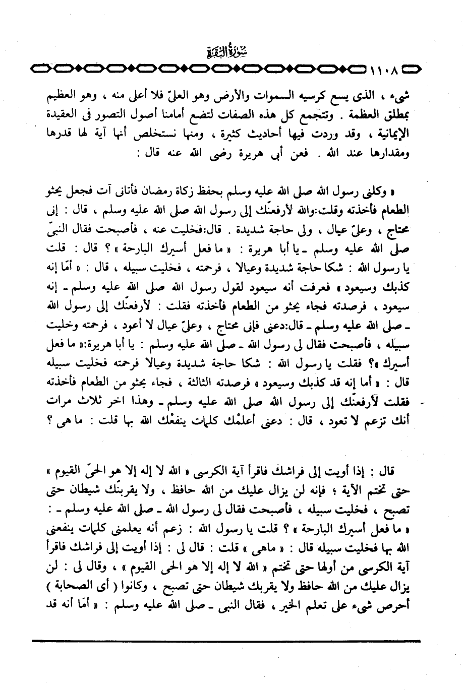 شيء، الذي يسع كرسيه السماوات والأرض وهو العليّ فلا أعلى منه، وهو العظيم بمطلق العظمة. وتتجمع كل هذه الصفات لتضع أمامنا أصول التصور في العقيدة الإيمانية، وقد وردت فيها أحاديث كثيرة، ومنها نستخلص أنها آية لها قدرها ومقدارها عند الله. «فعن أبي هريرة رَضِيَ اللَّهُ عَنْه قال:» وكلني رسول الله صَلَّى اللَّهُ عَلَيْهِ وَسَلَّم َ بحفظ زكاة رمضان فأتاني آت فجعل يحثو الطعام فأخذته وقلت والله لأرفعنك إلى رسول الله صَلَّى اللَّهُ عَلَيْهِ وَسَلَّم َ، قال: إني محتاج، وعليّ عيال، ولي حاجة شديدة. قال: فخليت عنه، فأصبحت فقال النبي صَلَّى اللَّهُ عَلَيْهِ وَسَلَّم َ يا أبا هريرة: «ما فعل أسيرك البارحة» ؟ قال: قلت يا رسول الله: شكا حاجة شديدة وعيالا، فرحمته، فخليت سبيله، قال: «أما إنه كذبك وسيعود» فعرفت أنه سيعود لقول رسول الله صَلَّى اللَّهُ عَلَيْهِ وَسَلَّم َ إنه سيعود، فرصدته فجاء يحثو من الطعام فأخذته فقلت: لأرفعنك إلى رسول الله صَلَّى اللَّهُ عَلَيْهِ وَسَلَّم َ قال: دعني فإني محتاج، وعلي عيال لا أعود، فرحمته وخليت سبيله، فأصبحت فقال لي رسول الله صَلَّى اللَّهُ عَلَيْهِ وَسَلَّم َ: يا أبا هريرة: «ما فعل أسيرك» ؟ فقلت يا رسول الله: شكا حاجة شديدة وعيالا فرحمته فخليت سبيله قال: «أما إنه قد كذبك وسيعود» فرصدته الثالثة، فجاء يحثو من الطعام فأخذته فقلت لأرفعنك إلى رسول الله صَلَّى اللَّهُ عَلَيْهِ وَسَلَّم َ وهذا آخر ثلاث مرات أنك تزعم لا تعود، قال: دعني أعلمك كلمات ينفعك الله بها قلت: ما هي؟