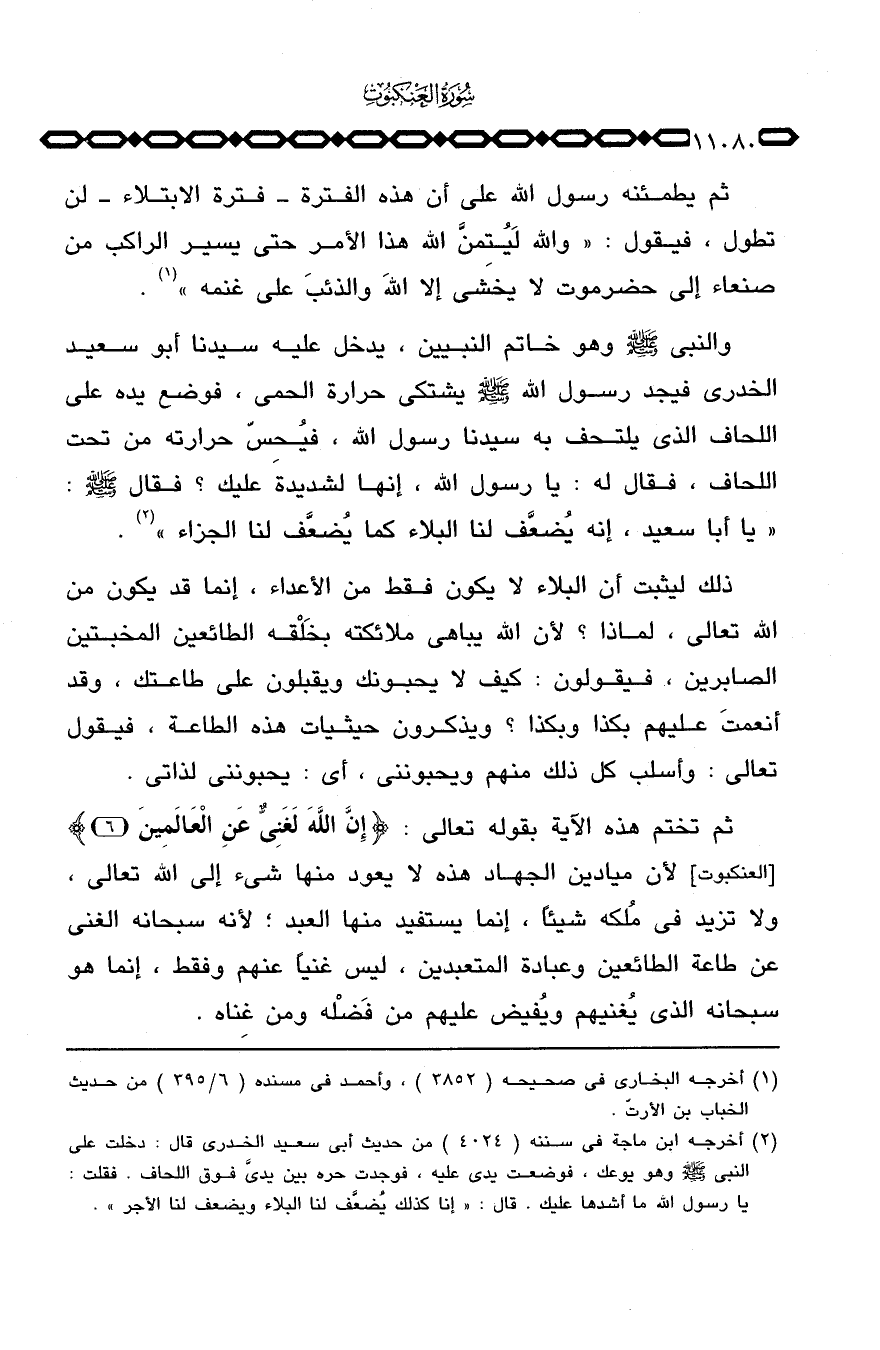 والنبي صَلَّى اللَّهُ عَلَيْهِ وَسَلَّم َ وهو خاتم النبيين، «يدخل عليه سيدنا أبو سعيد الخدري فيجد رسول الله صَلَّى اللَّهُ عَلَيْهِ وَسَلَّم َ يشتكي حرارة الحمى، فوضع يده على اللحاف الذي يلتحف به سيدنا رسول الله، فيُحِسّ حرارته من تحت اللحاف، فقال له: يا رسول الله، إنها لشديدة عليك؟ فقال صَلَّى اللَّهُ عَلَيْهِ وَسَلَّم َ:» يا أبا سعيد، إنه يُضعَّف لنا البلاء كما يُضعَّف لنا الجزاء «.