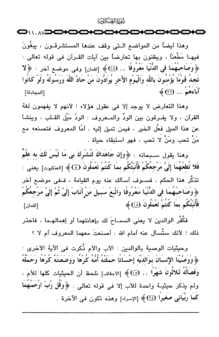 وهذا أيضاً من المواضع التي وقف عندها المستشرقون، يبغُونَ فيها مَطْعناً، ويظنون بها تعارضاً بين آيات القرآن في قوله تعالى: {وَصَاحِبْهُمَا فِي الدنيا مَعْرُوفاً ... } [لقمان: 15] وفي موضع آخر: {لاَّ تَجِدُ قَوْماً يُؤْمِنُونَ بالله واليوم الآخر يُوَآدُّونَ مَنْ حَآدَّ الله وَرَسُولَهُ وَلَوْ كانوا آبَآءَهُمْ ... } [المجادلة: 22] .