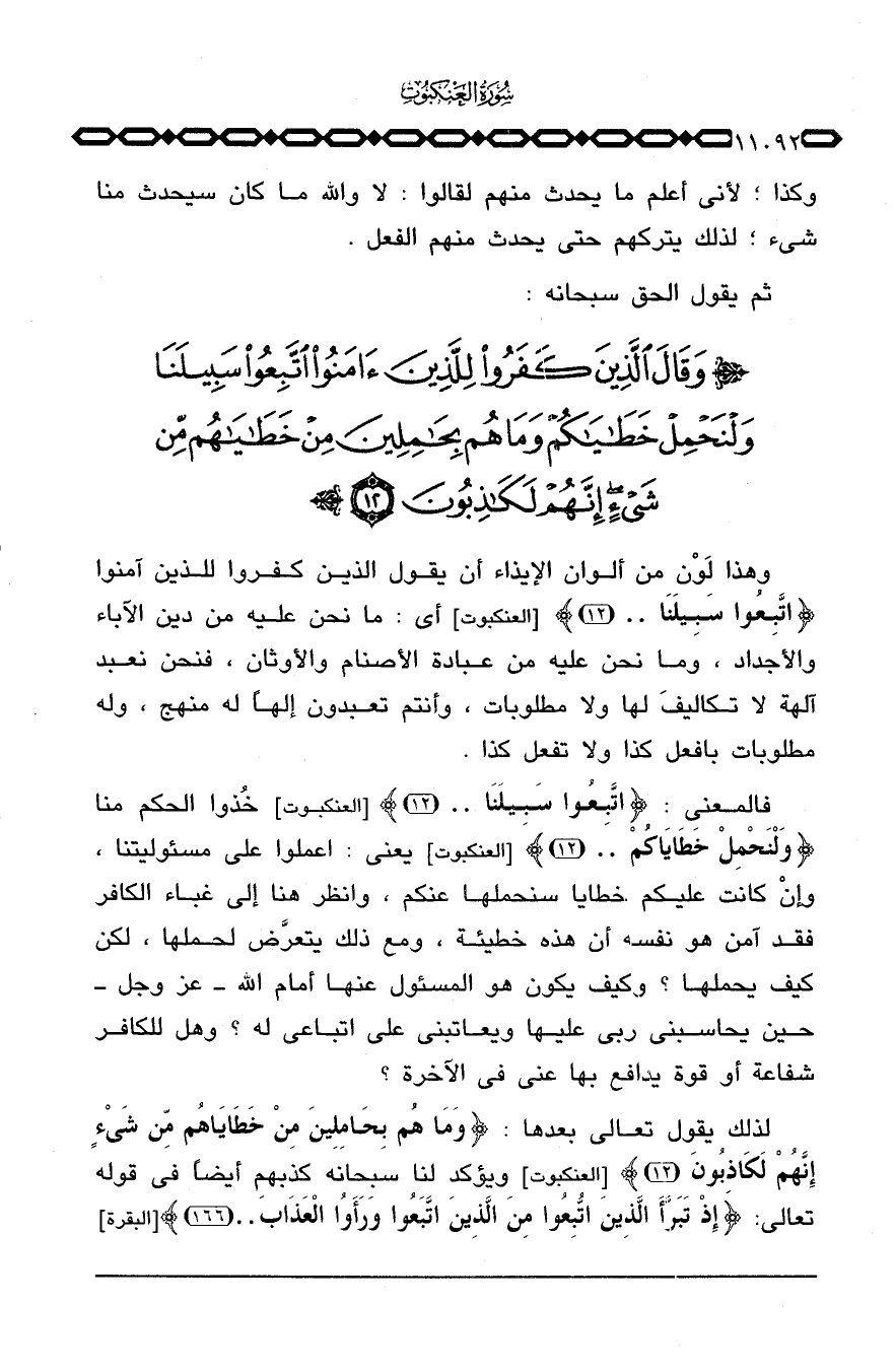 لذلك يقول تعالى بعدها: {وَمَا هُمْ بِحَامِلِينَ مِنْ خَطَايَاهُمْ مِّن شَيْءٍ إِنَّهُمْ لَكَاذِبُونَ} [العنكبوت: 12] ويؤكد لنا سبحانه كذبهم أيضاً في قوله تعالى: {إِذْ تَبَرَّأَ الذين اتبعوا مِنَ الذين اتبعوا وَرَأَوُاْ العذاب ... } [البقرة: 166] .