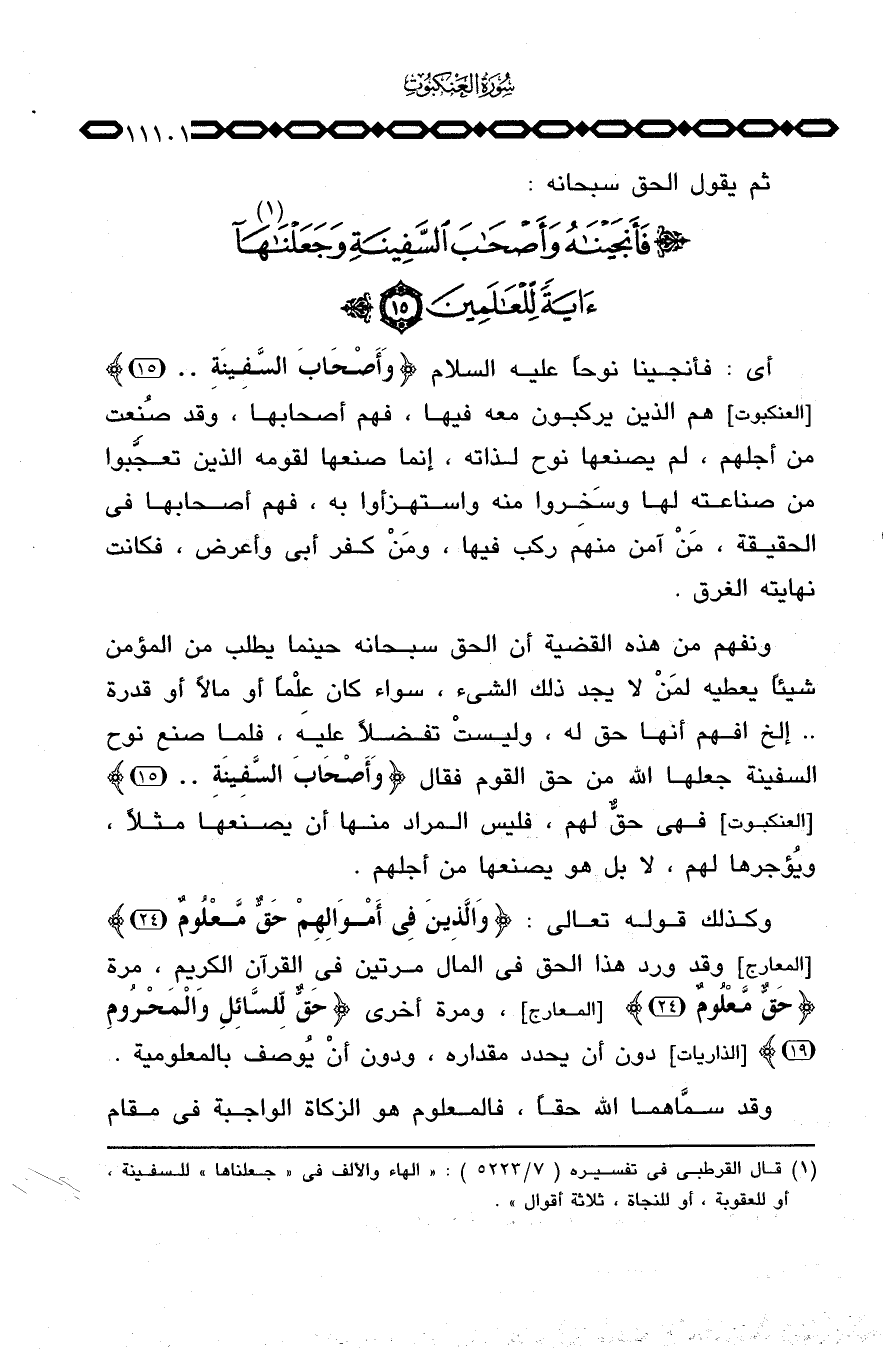 ونفهم من هذه القضية أن الحق سبحانه حينما يطلب من المؤمن شيئاً يعطيه لمَنْ لا يجد ذلك الشيء، سواء كان عِلْماً أو مالاً أو قدرة. . إلخ افهم أنها حق له، وليستْ تفضلاً عليه، فلما صنع نوح السفينة جعلها الله من حق القوم فقال {وأَصْحَابَ السفينة ... } [العنكبوت: 15] فهي حقٌّ لهم، فليس المراد منها أن يصنعها مثلاً، ويُؤجرها لهم، لا بل هو يصنعها من أجلهم.